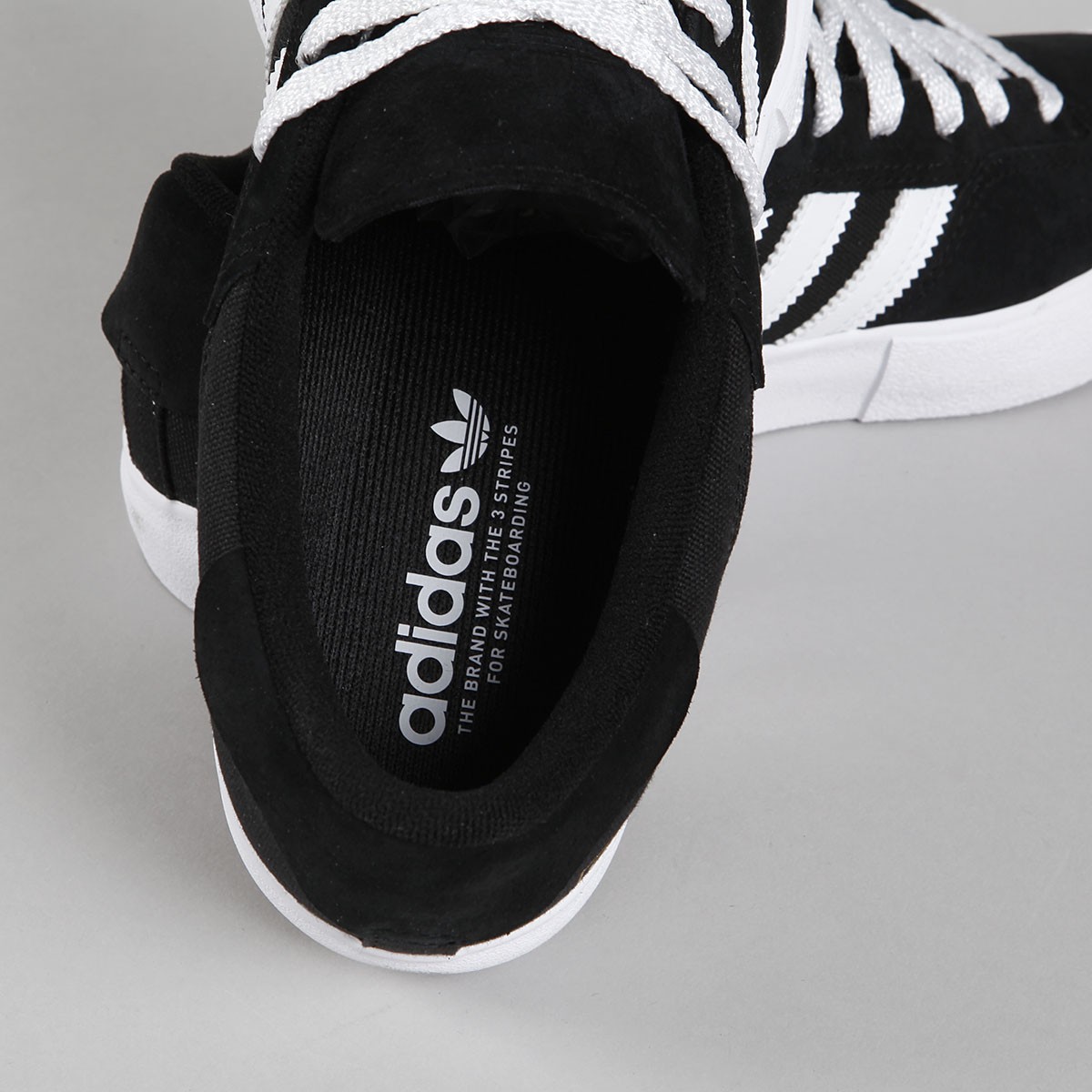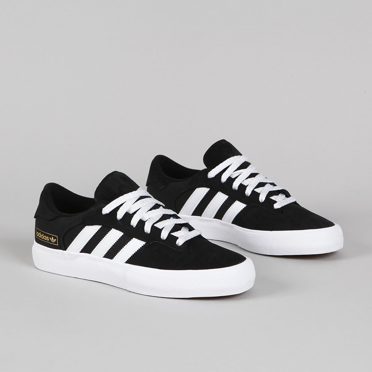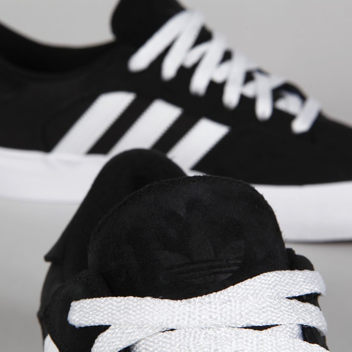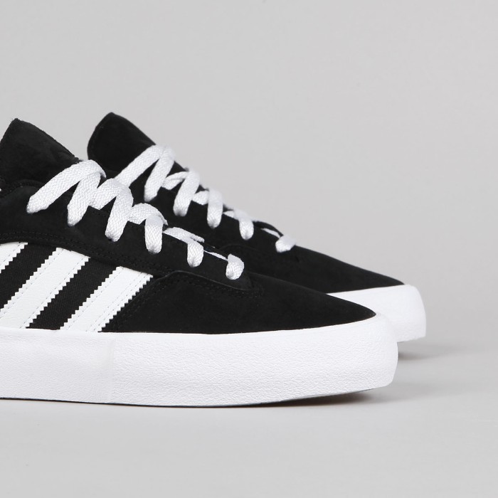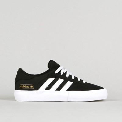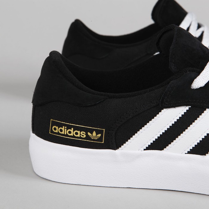 Jednoduchá silueta skate boty Adidas Matchbreak Super s dvojitým prošíváním v oblasti špičky a kotníku. Nový model Matchbreak Super je inspirován staršími modely z archivu značky. Klasický černo-bílý semišový svršek, vulkanická podrážka, zesílení Adi-Zone, vystužená gumová špička Adituff a vnitřní stélka s technologií adiPRENE, která tlumí nárazy. Lem podrážky je lehce zvýšený, umožňuje hlubší usazení chodidla pro lepší kontakt s prknem a zároveň chrání před opotřebením semišových částí boty. Polstrovaný lem kotníku, po stranách ikonické tři pruhy v kontrastní bílé barvě. Pod kotníkem zlatý nápis s logem Adidas.