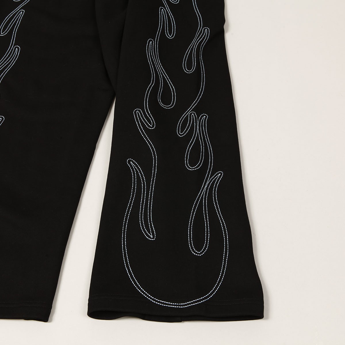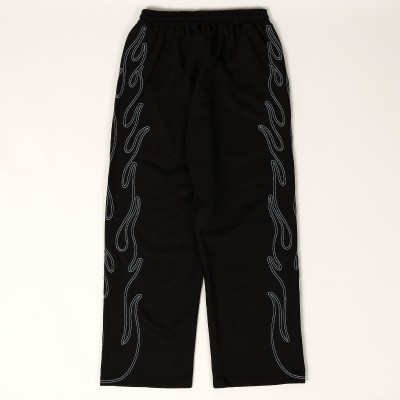 Mají široký baggy střih s mírným zúžením nohavic. Po stranách kapsy s lemováním. Nohavice zdobí výšivka kontrastního plamene po celé délce.