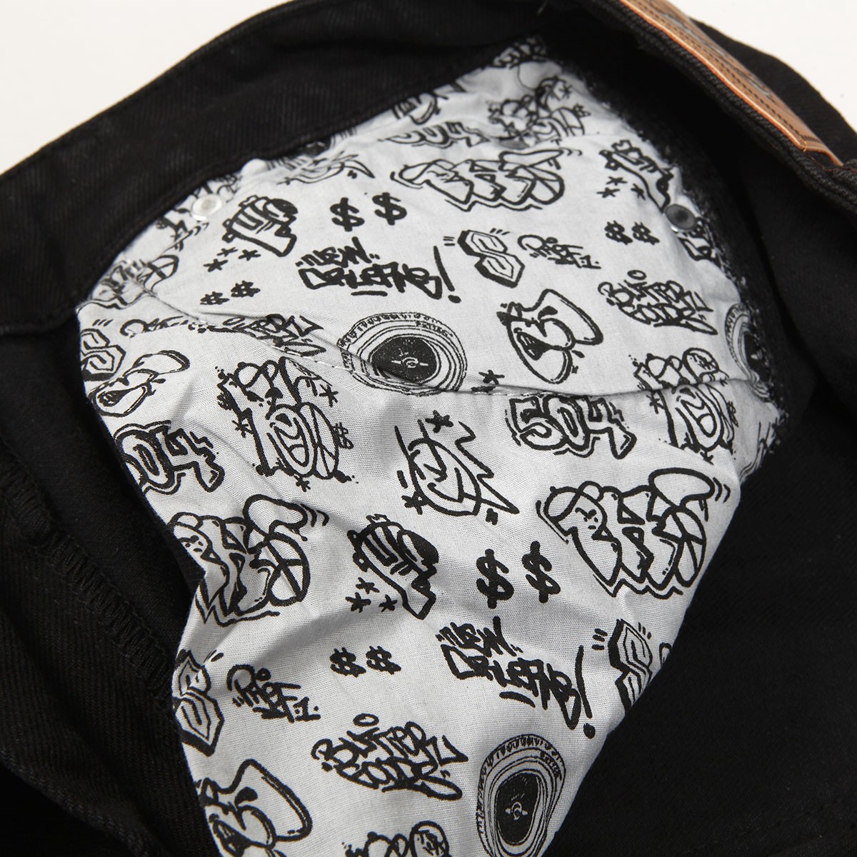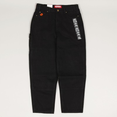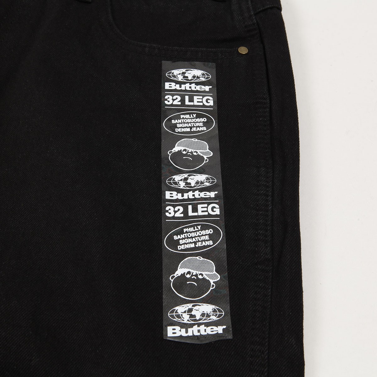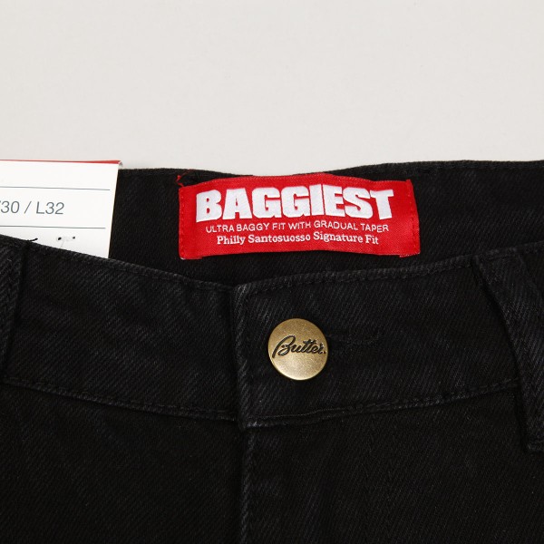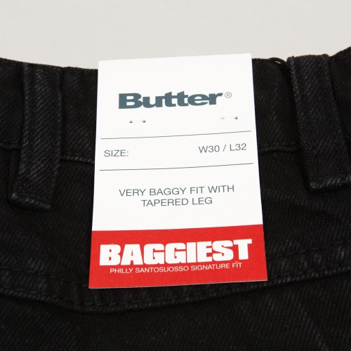 Jeanové kalhoty z kolekce australské značky Butter Goods, kterou v roce 2008 založili skateři a kamarádi Garth Mariano a Matt Evans. Model s názvem Santosuosso Double Knee Denim Jeans Pants v seprané černé barvě má nejširší Baggiest střih. Na pravé přední kapse vyšitý obličej kluka a na zadní kapse nášivka s logem značky. Našitá dvojitá vrstva látky na kolenou. Na pravé nohavici malé kapsičky na drobnosti. V pase ukrytá tkanička na stahování. Na horním lemu na pravé straně obdélníková kožená nášivka s vyraženým labelem Butter.