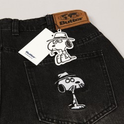 Mají široký Baggy Fit střih s mírným zúžením nohavic. V pravé přední kapse vlaječka Butter a na zadní kapse nášivka Snoopyho bratra Spika, který nosí klobouk a knírek. Na horním lemu obdélníková nášivka s vyraženým labelem.