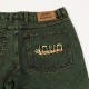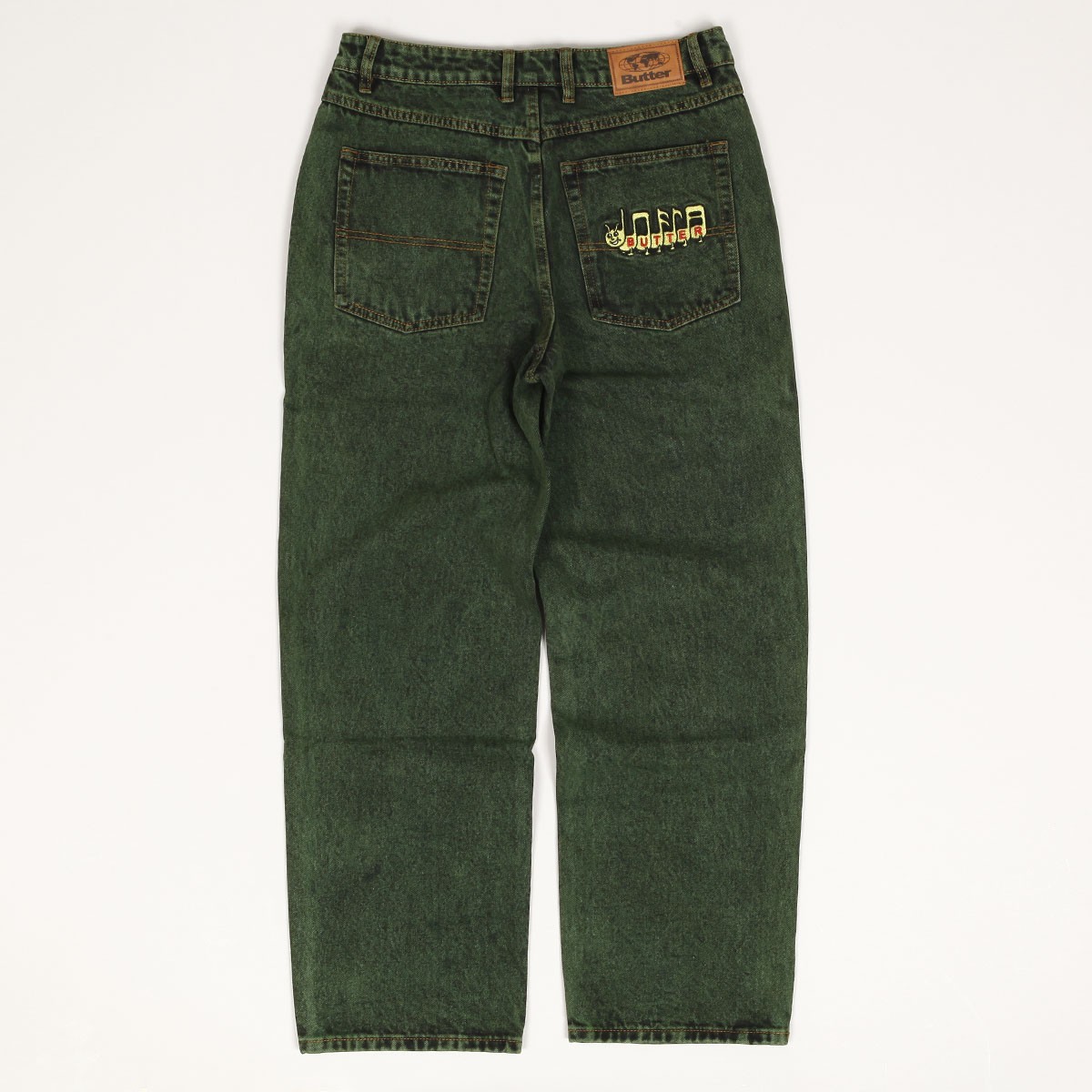 Jeanové kalhoty z kolekce australské značky Butter Goods, kterou v roce 2008 založili skateři a kamarádi Garth Mariano a Matt Evans. Model s názvem Caterpillar Denim Pants v seprané zelené barvě má volný Relaxed střih. Na pravé přední kapse nášivka s logem značky a na zadní kapse vyšitá housenka z not s nápisem Butter. V pase ukrytá tkanička na stahování. Na horním lemu na pravé straně obdélníková kožená nášivka s vyraženým labelem Butter.