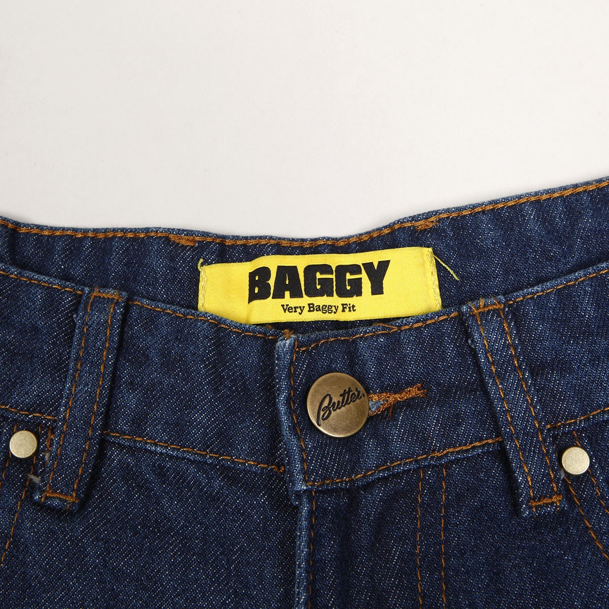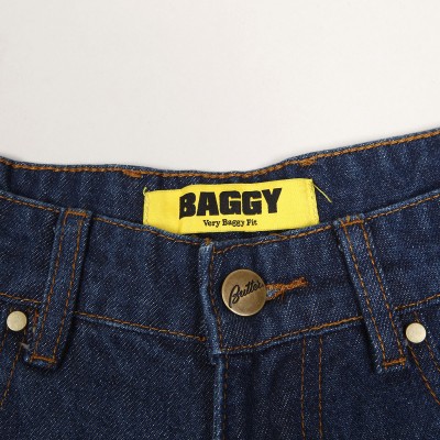 Jeanové kalhoty z kolekce australské značky Butter Goods, kterou v roce 2008 založili skateři a kamarádi Garth Mariano a Matt Evans. Model s názvem Hound Denim Pants v tmavě modré barvě má široký Baggy střih. Na pravé přední a zadní kapse vyšitý obrázek psa. V pase ukrytá tkanička na stahování. Na horním lemu na pravé straně obdélníková kožená nášivka s vyraženým labelem Butter.