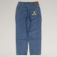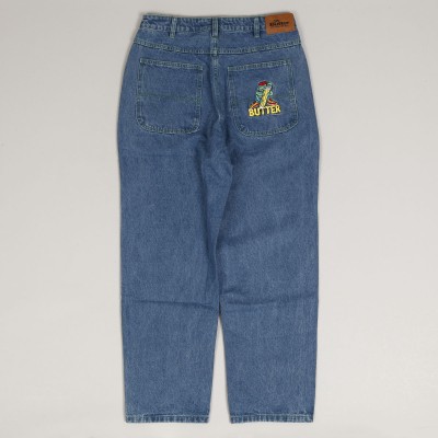 Jeanové kalhoty z kolekce australské značky Butter Goods, kterou v roce 2008 založili skateři a kamarádi Garth Mariano a Matt Evans. Model s názvem Martian Denim Jeans Pants v seprané modré barvě má šíroký Very Baggy střih a zelené prosívání. Na přední kapse a zadní kapse vyšitý mimozemšťan. V pase ukrytá tkanička na stahování. Na horním lemu na pravé straně obdélníková kožená nášivka s vyraženým labelem Butter.