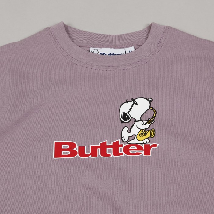 Triko z kolekce australské značky Butter Goods, kterou v roce 2008 založili skateři a kamarádi Garth Mariano a Matt Evans. Kolaborace se známým komixem Peanuts, vytvořeným Charlesem M. Schulzem. Model Jazz Logo Tee v seprané barvě borůvek má na prsou natištěný kontrastní nápis Butter se psem Snoopym hrajícím na saxofon.