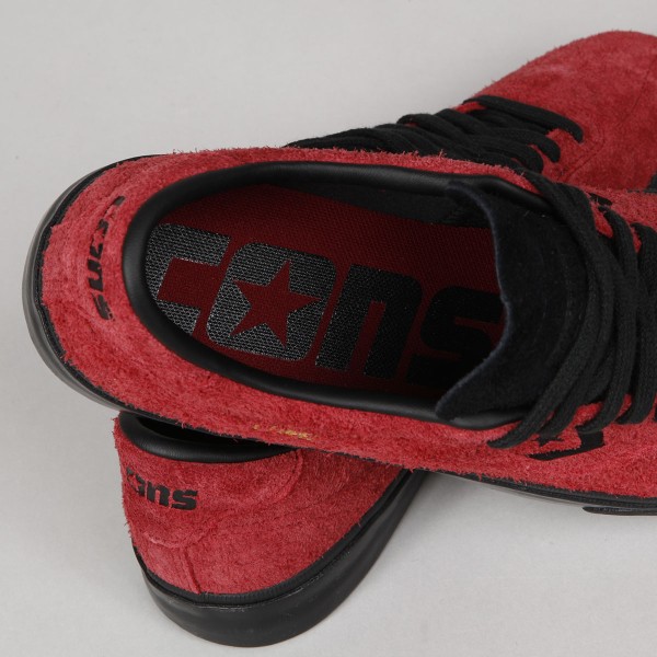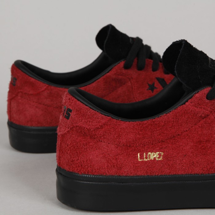 Boty Converse CONS. Pro-model Louie Lopez Pro v cihlovém semišovém provedení ( chlupatý semiš) a s černou vulkanickou podrážkou. Čistá, dlouhá špička s decetním prošíváním a kožený vnitřek patky, který také prodlouží její životnost. Z boku boty je vyšité černé kontrastní logo Star Chevron. Polstrovaný lem kolem kotníku, odolná špička a vnitřní vložka s technologií Nike Zoom Air pro měkkčí dopady a větší pohodlí. Zlatý nápis L. Lopez na vnější straně bot. Na perforovaném jazyku je pak vyražené logo Converse CONS. Jedna stélka se signaturou LOPEZ a druhá s logem CONS.
