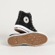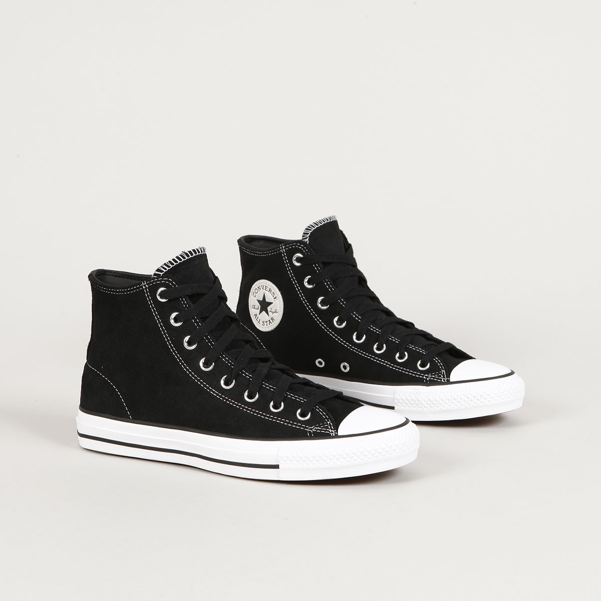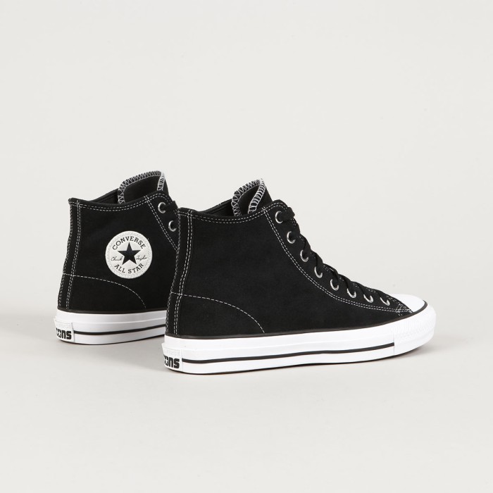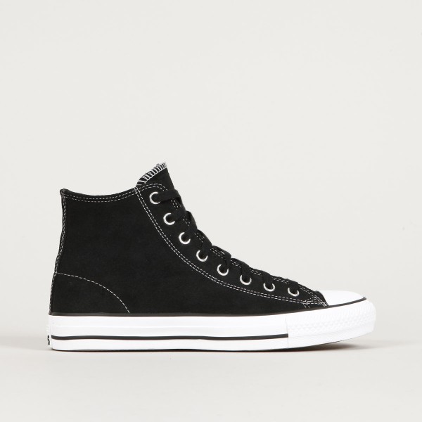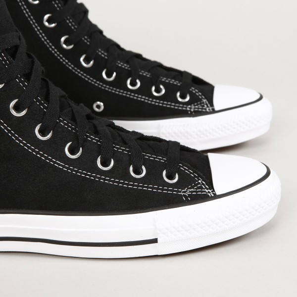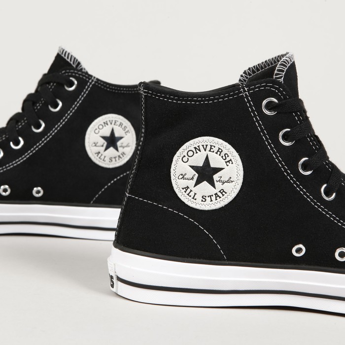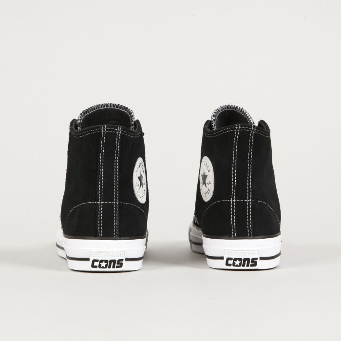 Boty Converse ze skejtové řady CONS. Model Chuck Taylor All Star Hi Pro v černé barvě s konstrastní bílou nášivkou a bílou vulc podrážkou. Svršek vyrobený ze semiše. Lehce polstrovaný lem kolem kotníku, elastický klínek na jazyku, odolná gumová špička a vnitřní pěnová vložka z CX pěny pro měkkčí dopady a větší pohodlí. Kovová očka pro tkaničky a dvě na odvětrávání na vnitřku boty. Na boku boty nášivka Chuch Taylor All Star a na patce vyražené logo Converse Cons. V balení tkaničky navíc.