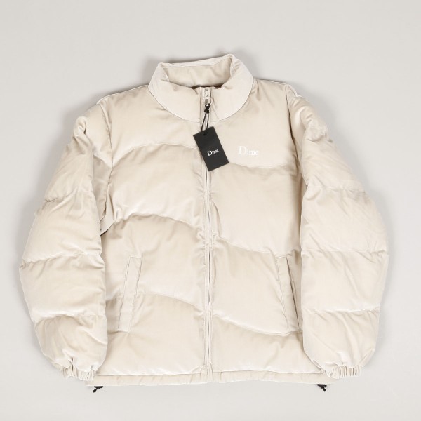 Bunda Dime s názvem Velvet Quilted Puffer Jacket v béžové barvě. Na levé straně prsou vyšité decentní logo Dime. Celoplošné vlnkaté prošívání. Jemný sametový svršek, uvnitř Loftech izolace. Zapínání na zip YKK, v předu dvě kapsy. Elastické zakončení rukávů a pasu. Materiál 95% polyester a 5% spandex.