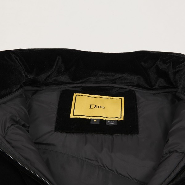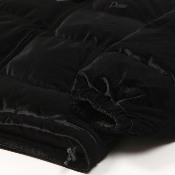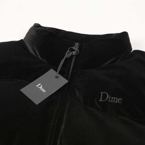 Bunda Dime s názvem Velvet Quilted Puffer Jacket v černé barvě. Na levé straně prsou vyšité decentní logo Dime. Celoplošné vlnkaté prošívání. Jemný sametový svršek, uvnitř Loftech izolace. Zapínání na zip YKK, v předu dvě kapsy. Elastické zakončení rukávů a pasu. Materiál 95% polyester a 5% spandex.