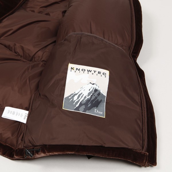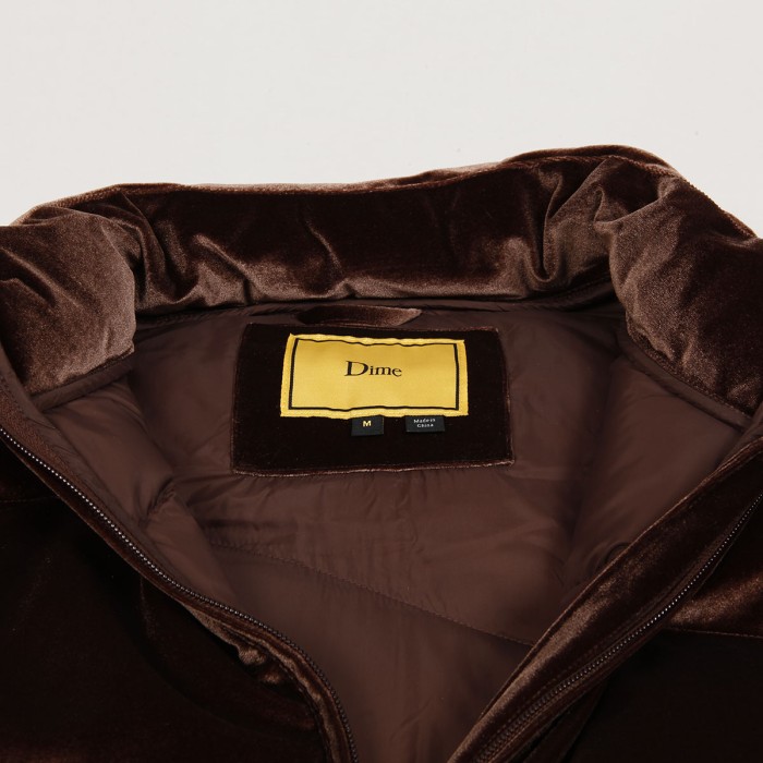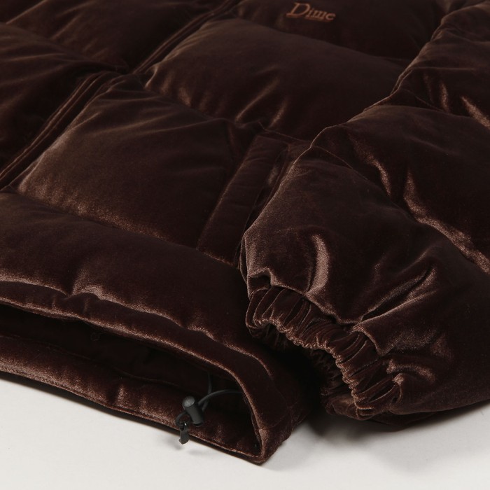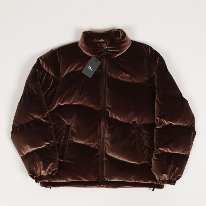 Bunda Dime s názvem Velvet Quilted Puffer Jacket v hnědé kávové barvě. Na levé straně prsou vyšité decentní logo Dime. Celoplošné vlnkaté prošívání. Jemný sametový svršek, uvnitř Loftech izolace. Zapínání na zip YKK, v předu dvě kapsy. Elastické zakončení rukávů a pasu. Materiál 95% polyester a 5% spandex.