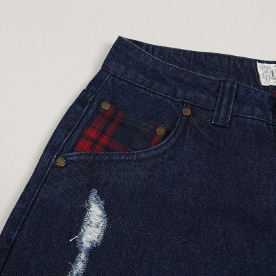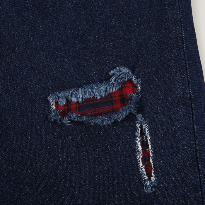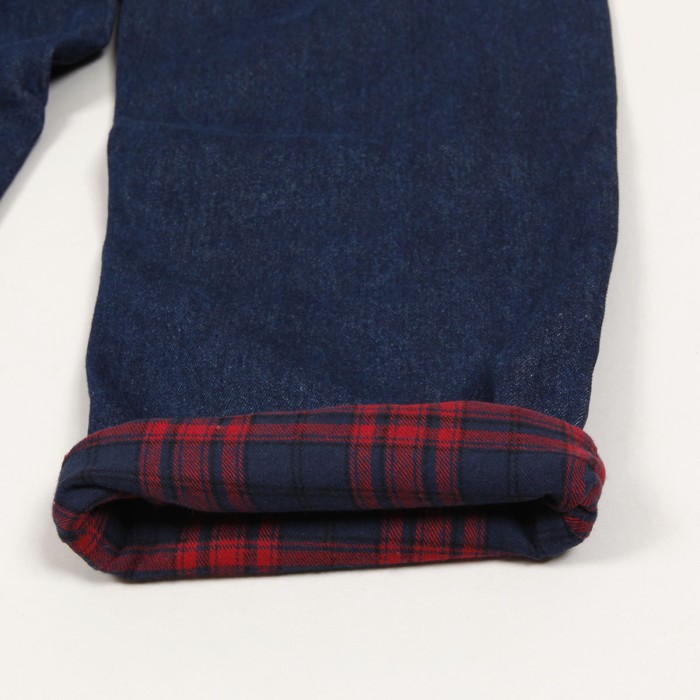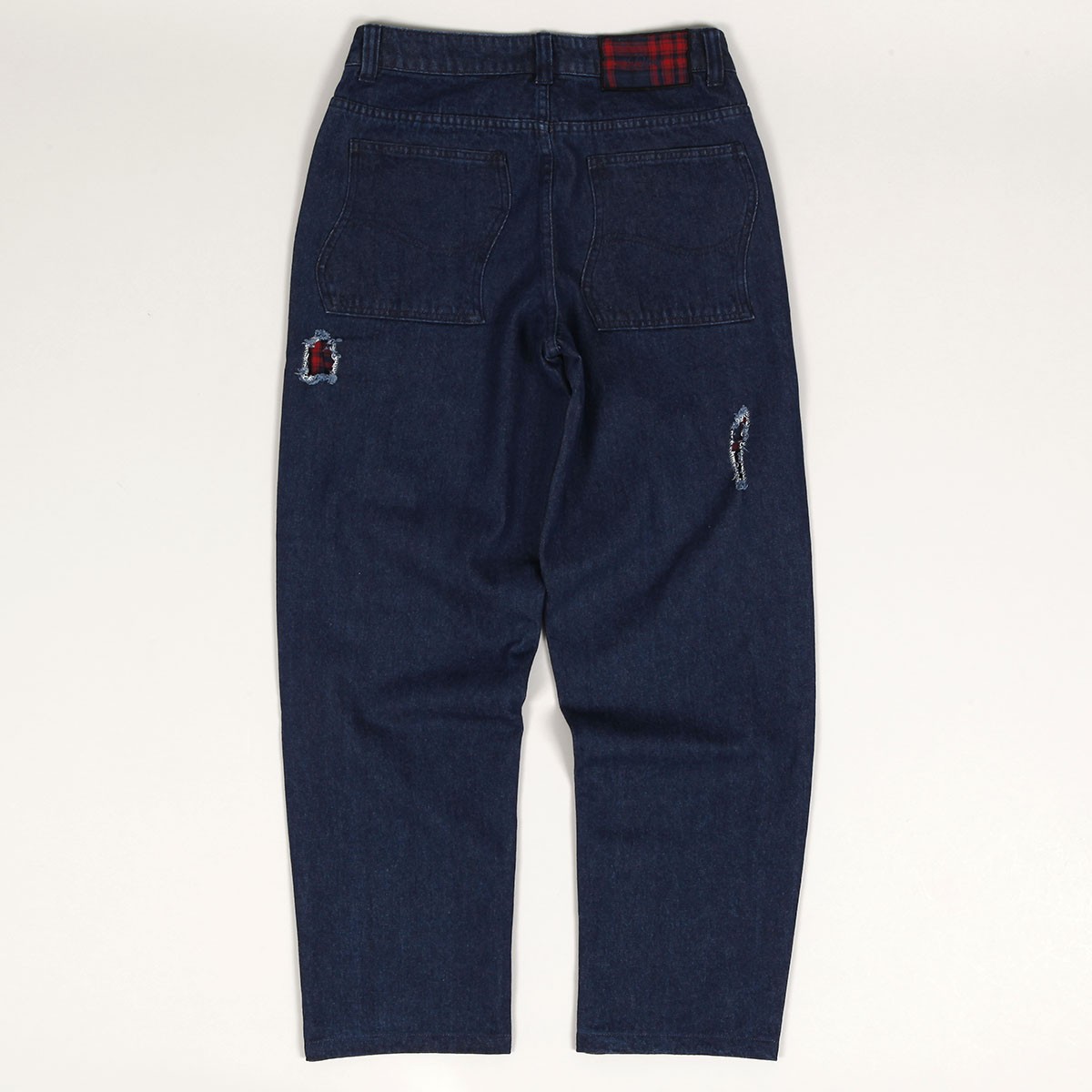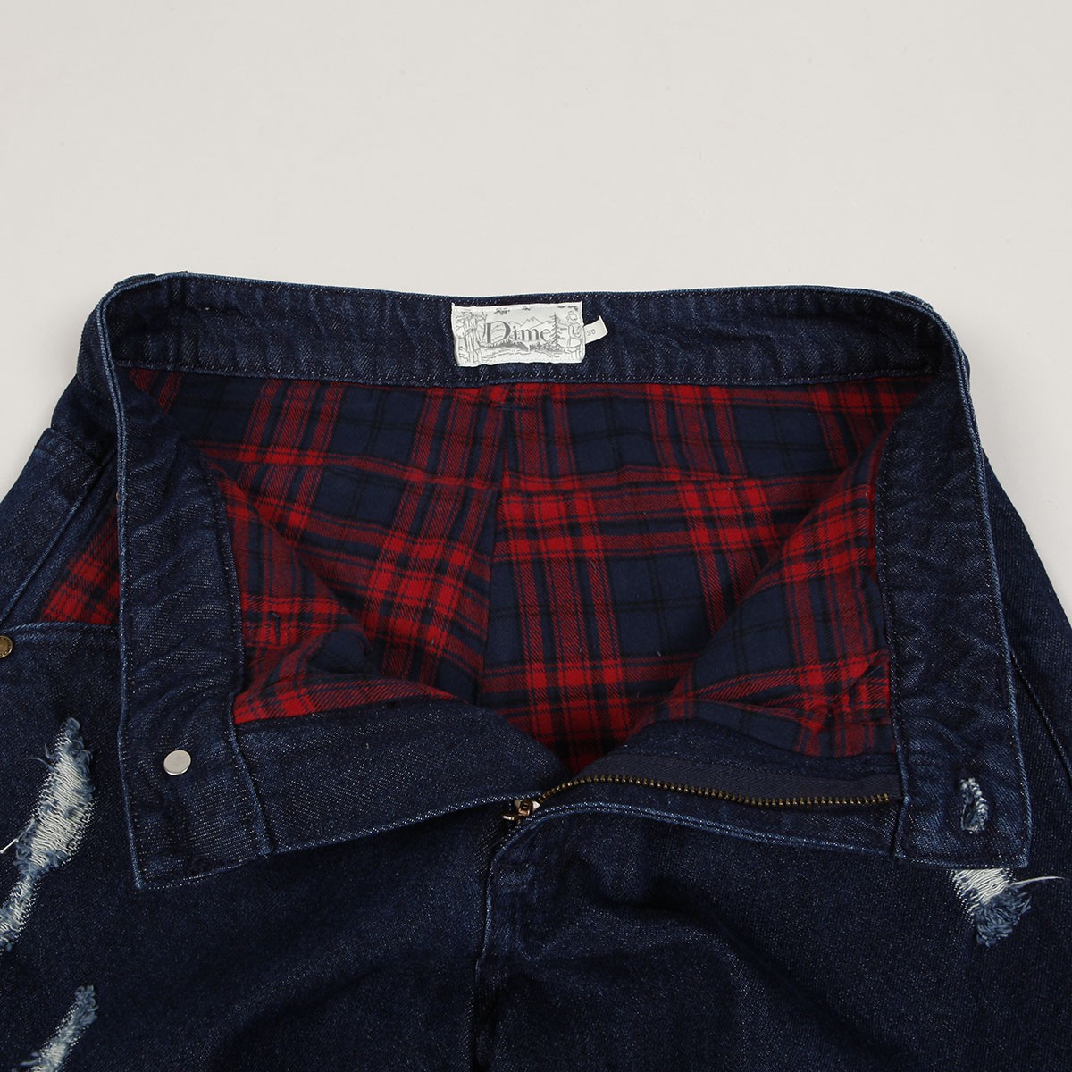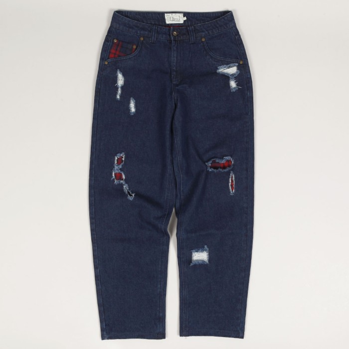 Jeanové kalhoty Dime s názvem Secret Baggy Denim Pants v tmavě modré barvě. Navíc vnitřní flanelová vrstva. Na přední levé kapse výšivka Dime. V pase kostkovaný Dime label. Zapínání na knoflík a zip YKK. Volný široký střih - Baggy fit. Materiál 100% bavlna a flanel.