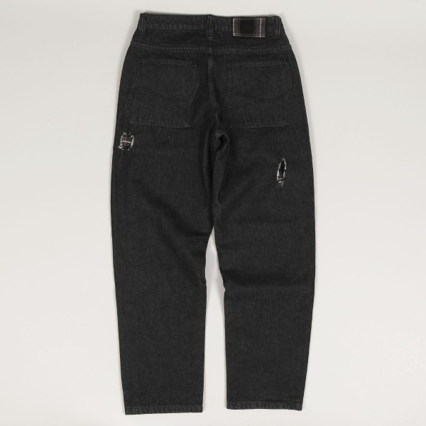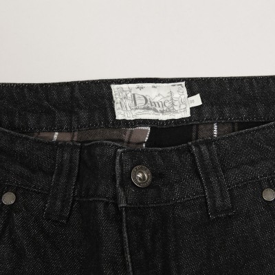 Jeanové kalhoty Dime s názvem Secret Baggy Denim Pants v seprané černé barvě. Navíc vnitřní flanelová vrstva. Na přední levé kapse výšivka Dime. V pase kostkovaný Dime label. Zapínání na knoflík a zip YKK. Volný široký střih - Baggy fit. Materiál 100% bavlna a flanel.