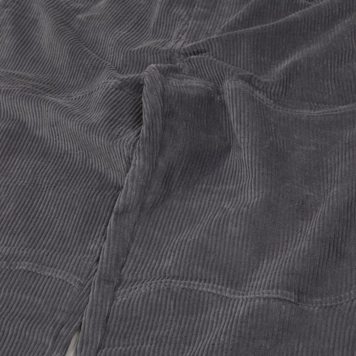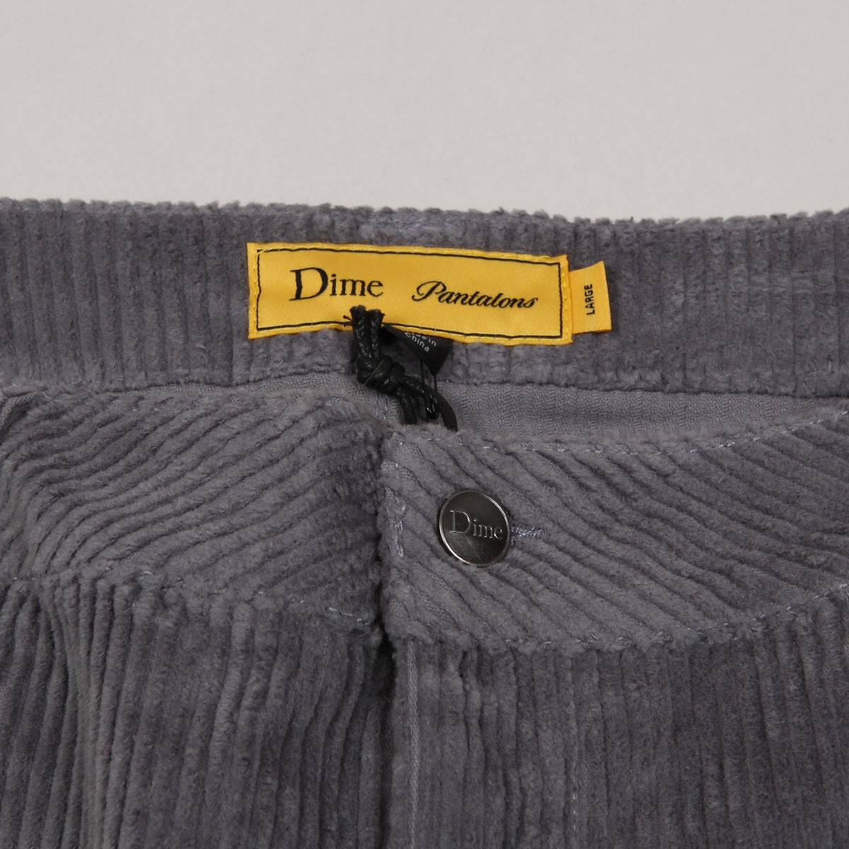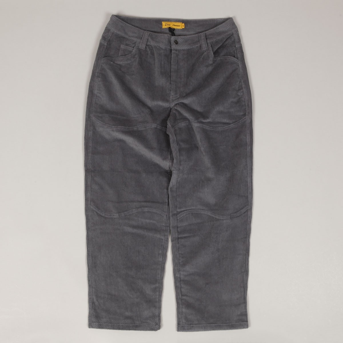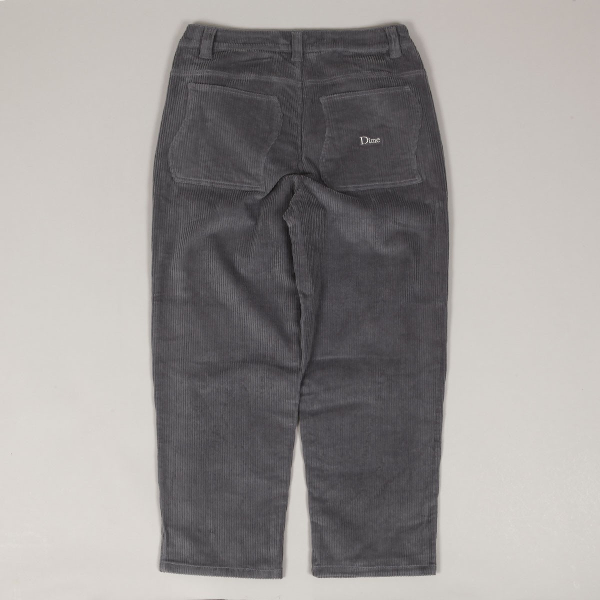 Manšestrové kalhoty Dime s názvem Baggy Corduroy Pants v šedé barvě. Na zadní pravé kapse vyšité malé logo Dime. Zapínání na knoflík a zip YKK. Volný široký střih - Baggy fit. Materiál 100% bavlna.