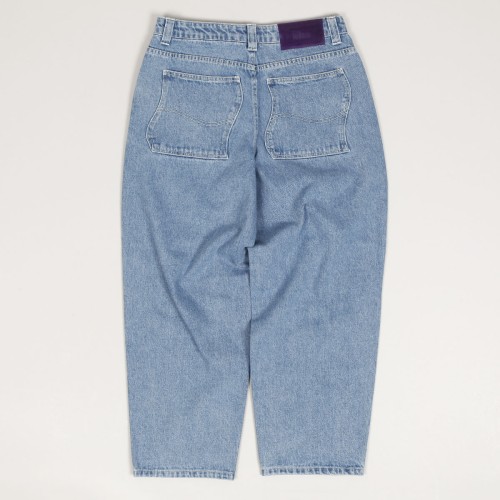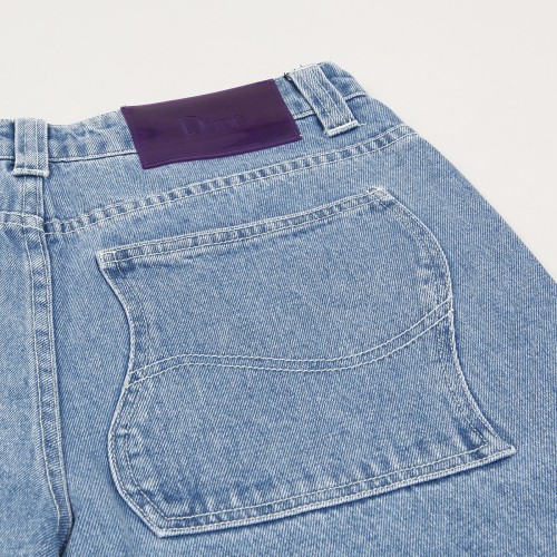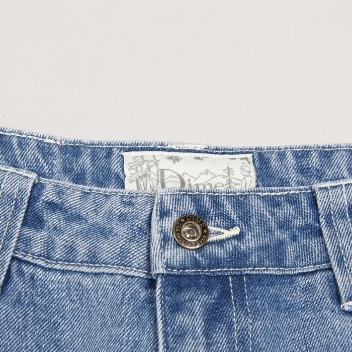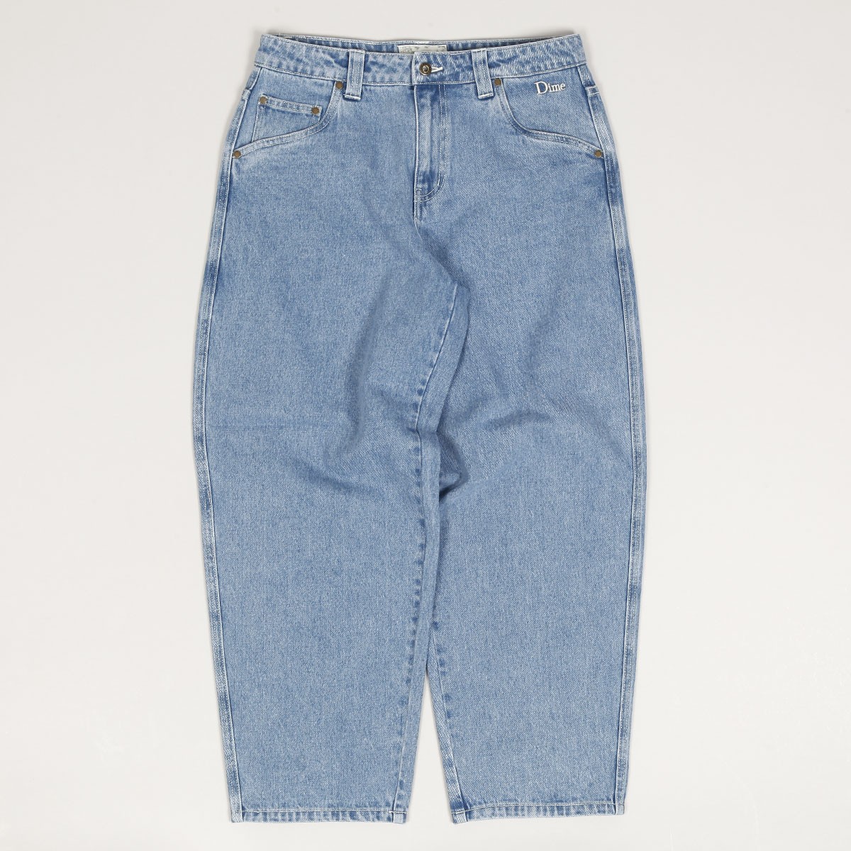 Jeanové kalhoty Dime s názvem Classic Baggy Denim Pants v seprané modré barvě. Na přední levé kapse výšivka Dime. V pase výšitý Dime label. Zapínání na knoflík a zip YKK. Volný široký střih - Baggy fit. Materiál 100% bavlna.