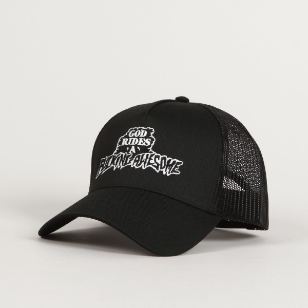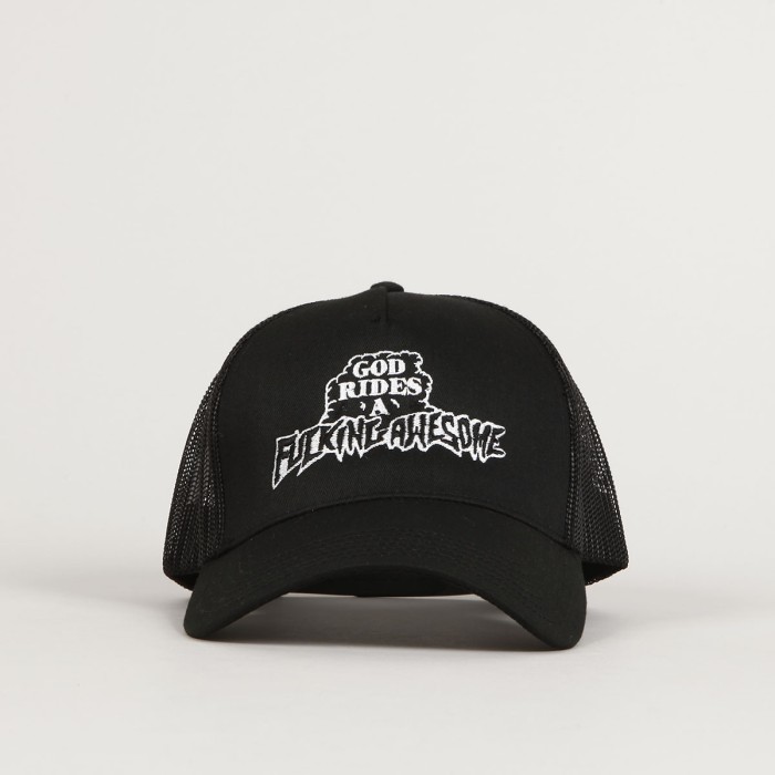 Kšiltovka Fucking Awesome s názvem God Rides FA Trucker Cap v černé barvě. Na čele má vyšitý kontrastní nápis God Rides a Fucking Awesome. Klasický střih truckerky, přední dva panely s větracími očky zbytek síťovaný. V zadní části plastový pásek na změnu velikosti. Vyrobeno ze 100% polyesteru.