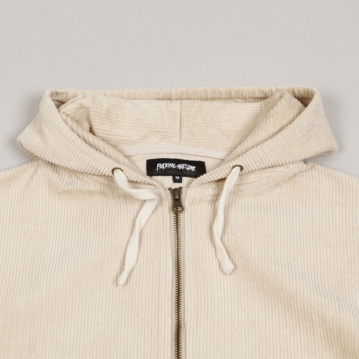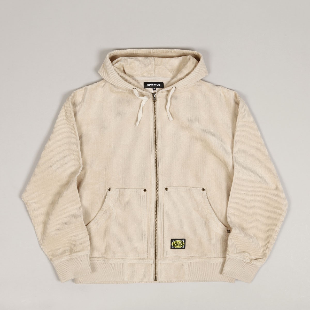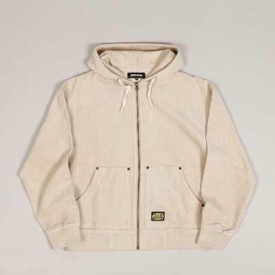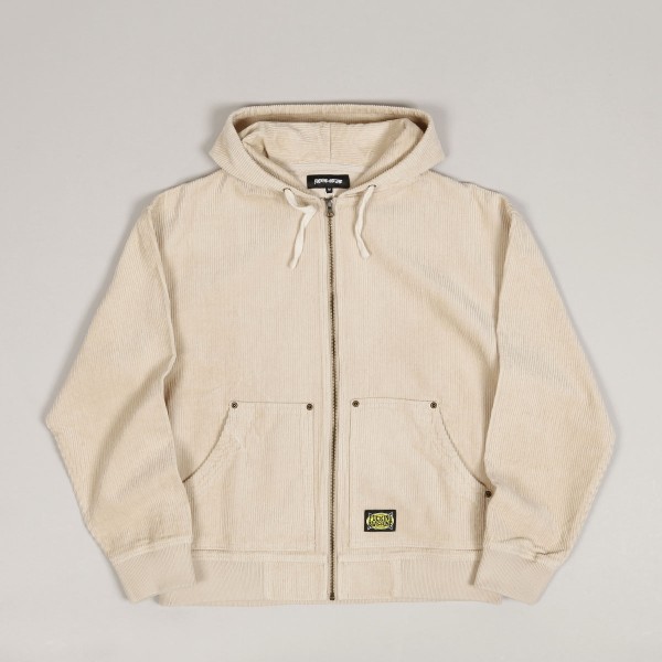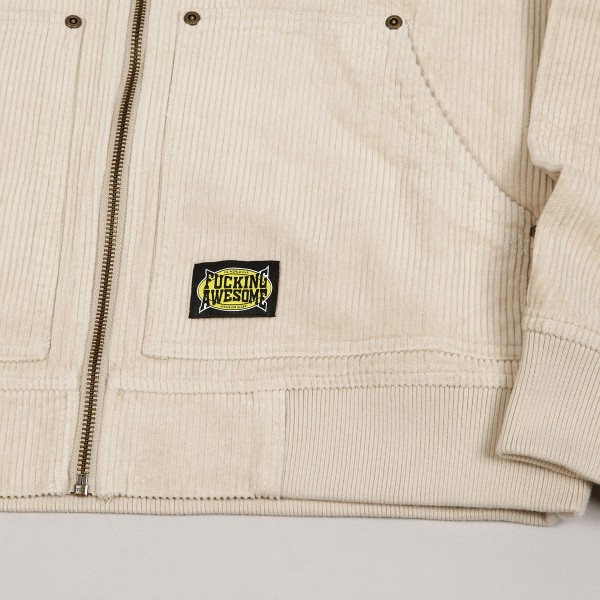 Mikina Fucking Awesome z nové kolekce, za kterou stojí skejtři Jason Dill a Anthony Van Engelen. Model s názvem KO Corduroy Zipped Hoodie v krémové barvě má na levé kapse malou decentní nášivku s logem Fucking Awesome. Stahovatelná kapuce, zapínání na zip a dvě větší přední kapsy. Zúžené žebrované rukávy a pas. Materiál 100% bavlna s vyšší gramáží.