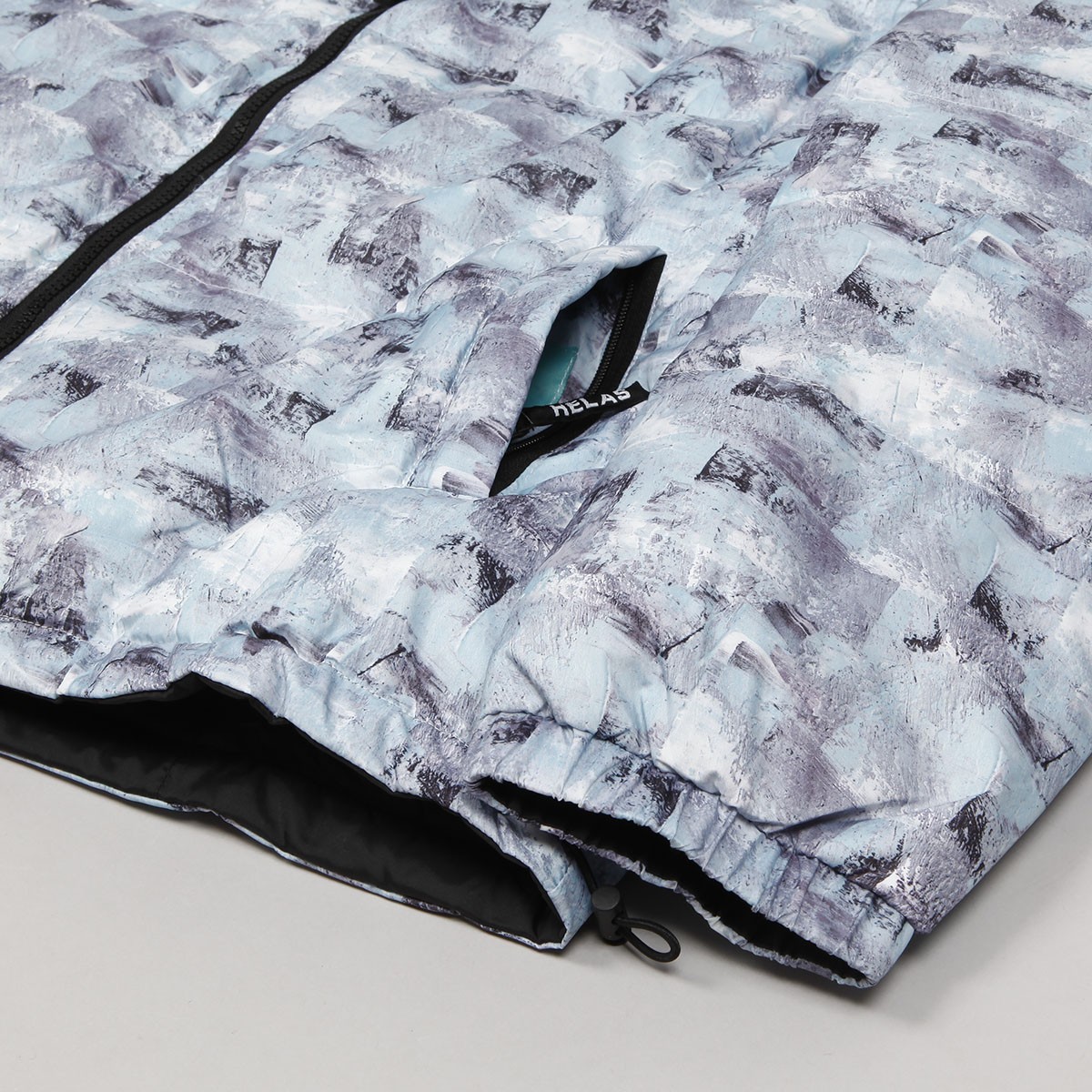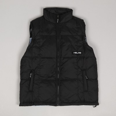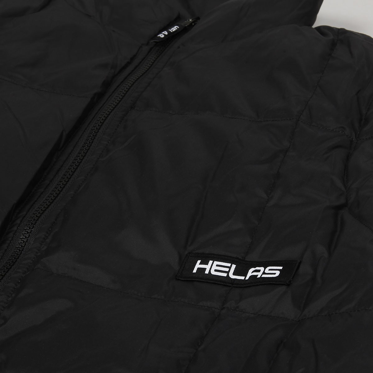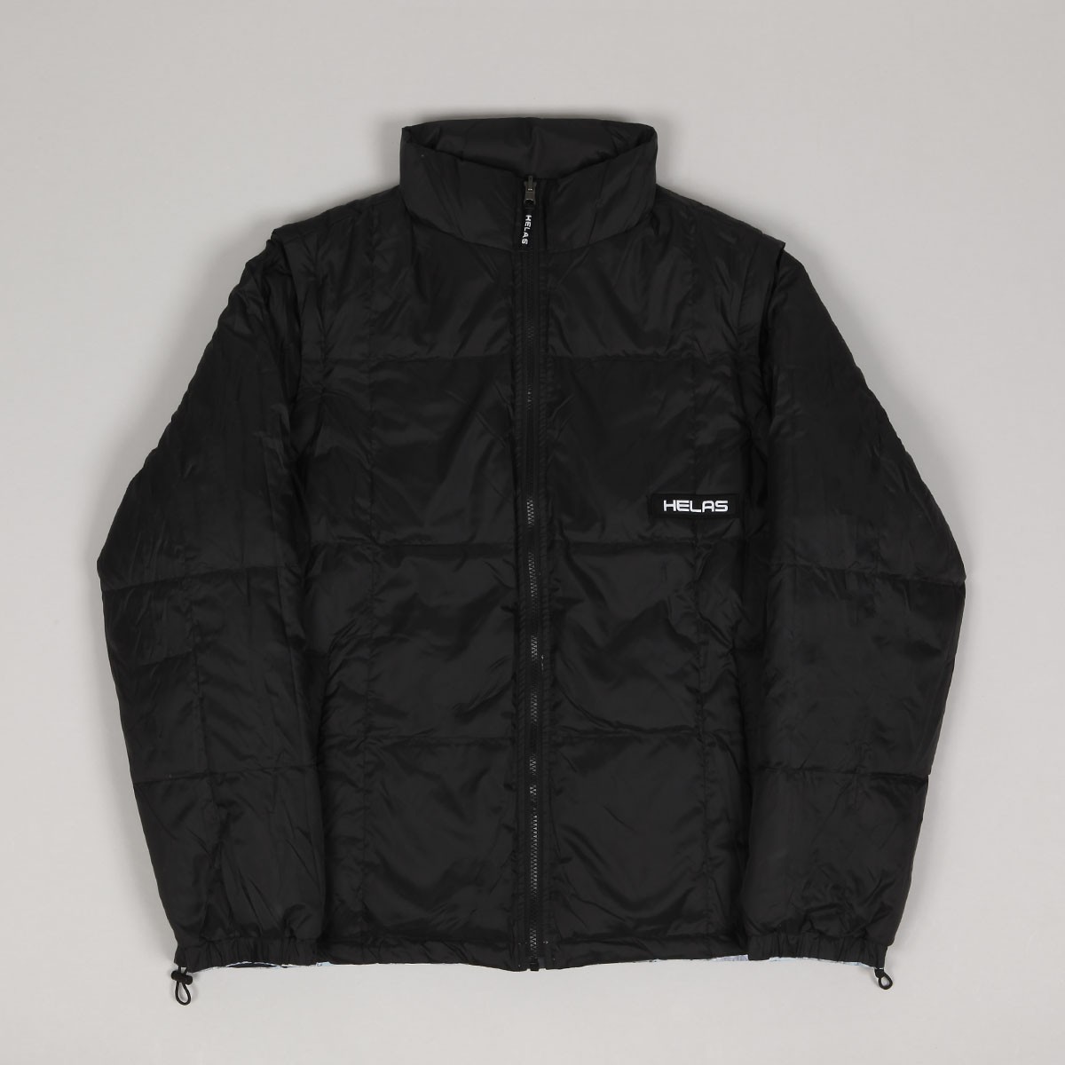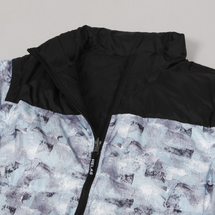 Oboustranná bunda Hélas od francouzské značky, kterou založil skater Lucas Puig a za kterou jezdí také Roman Lišivka a Marek Zápražný. Model s názvem Maze Reversible Jacket se zapínáním na zip a dvěma bočními kapsami. Elastický nastavitelný pas a odnímatelné rukávy, z bundy je možné udělat vestu. Uvnitr hřejivé polstrování. Z jedné strany abstraktní barevný potisk s lesklým nápisem Hélas mezi lopatkami. Z druhé strany čisté černé provedení s decentní nášivkou Hélas na levé straně prsou.