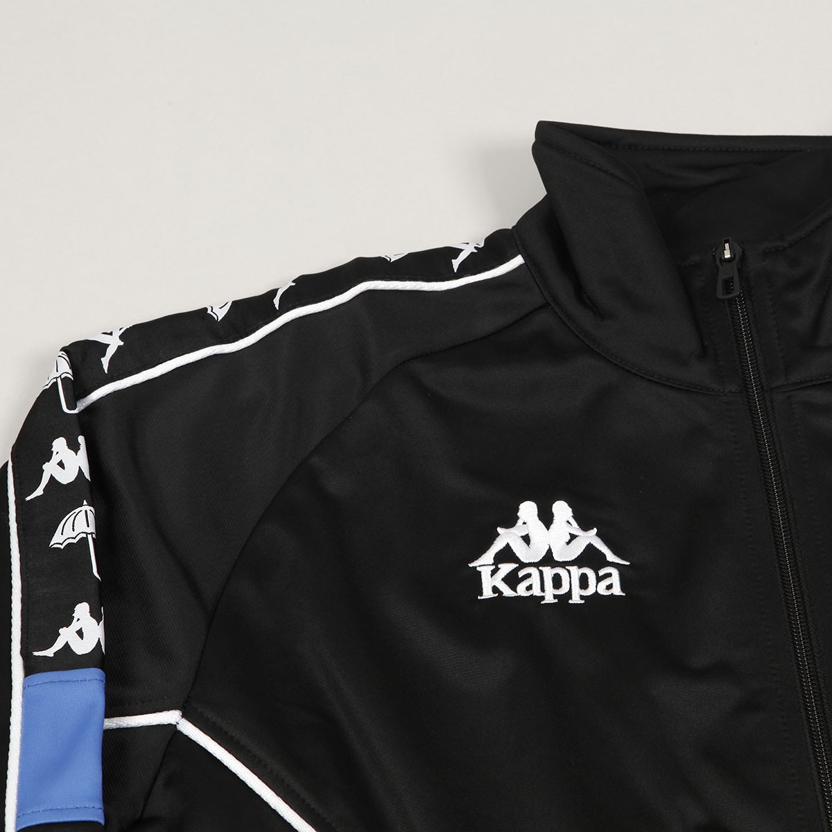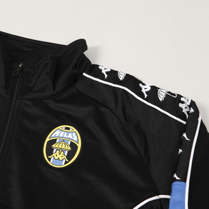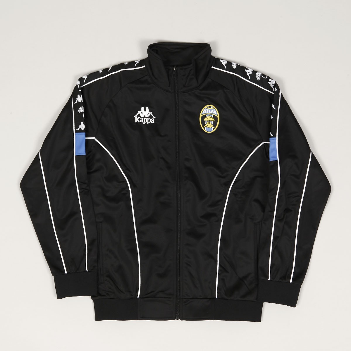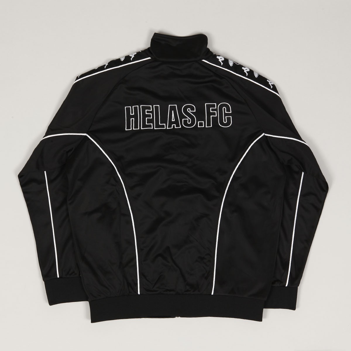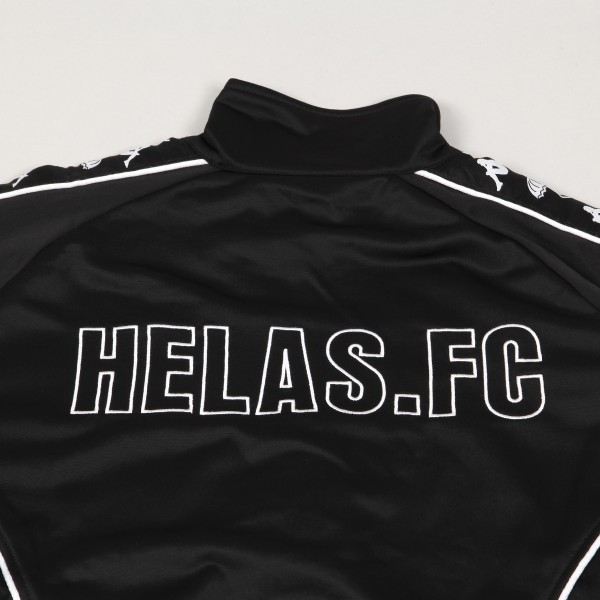 Bunda s motivy fotbalové sportovní soupravy. Na prsou jsou vyšitá loga Hélas a Kappa. Na zádech je velká výšivka nápisu HÉLAS.FC. Ramena a rukávy zdobí proužek s kontrasními logy obou značek.