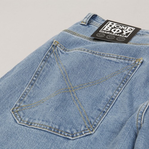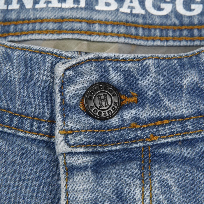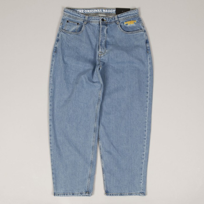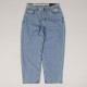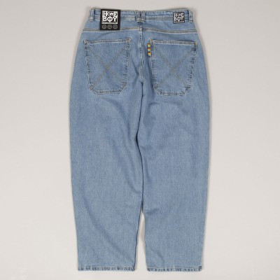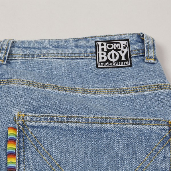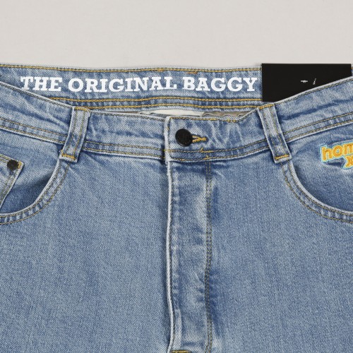 Jeanové kalhoty Homeboy s názvem X-Tra Monster Denim ve světle modré barvě Moon. Jsou inspirovány klasickým vintage vzhledem kalhot z 90. let. Mají super široký střih, vypasované boky a lehké zúžení konců nohavic. V levé přední kapse vyšitý kontrastní nápis Homeboy X-Tra. Na zadní kapse prošívání do X a decetní duhová vlaječka. Na horním lemu label Homeboy. Mají zapínáni na knoflíky. Vyrobeno z 99% bavlny a 1% elastanu.