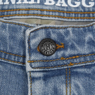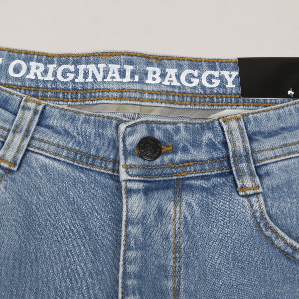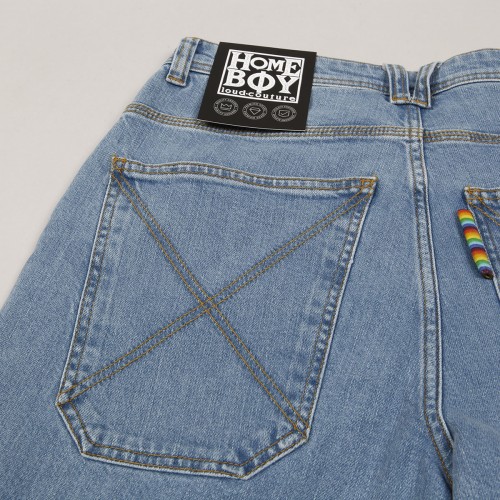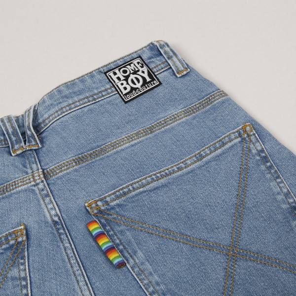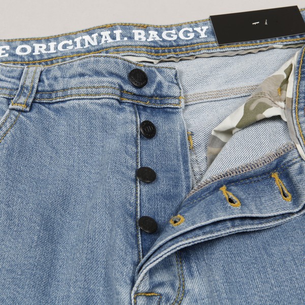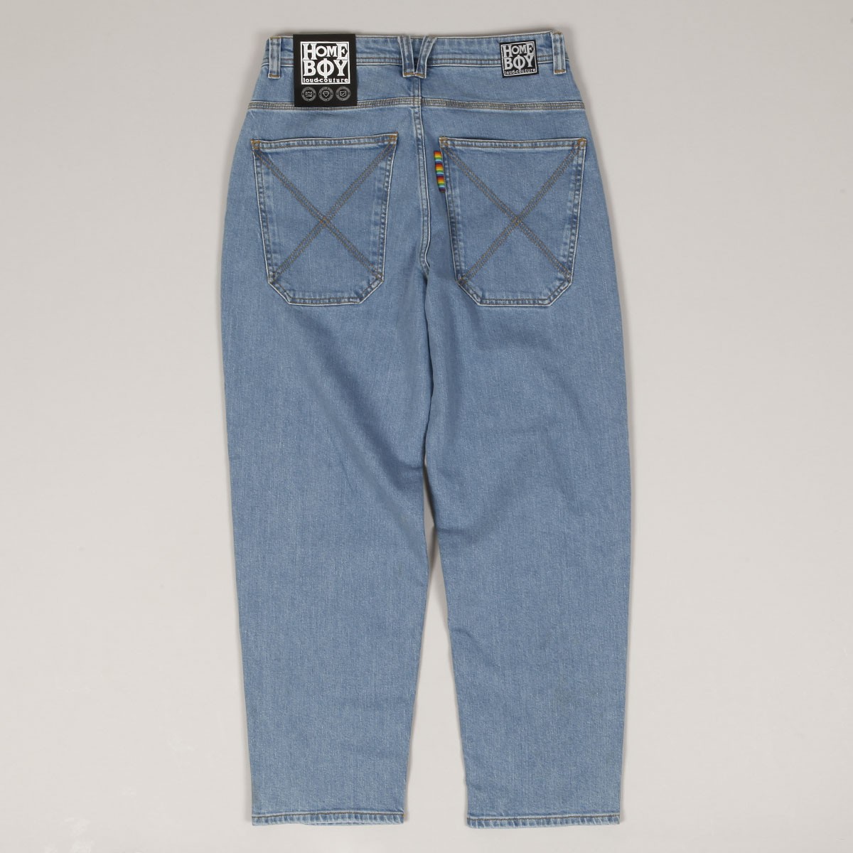 Jeanové kalhoty Homeboy s názvem X-Tra Baggy Denim ve světle modré barvě Moon. Jsou inspirovány klasickým vintage vzhledem kalhot z 90. let. Mají lehce zúžený střih od kolen ke koncům nohavic. V levé přední kapse vyšitý kontrastní nápis Homeboy X-Tra. Na zadní kapse prošívání do X a decetní duhová vlaječka. Na horním lemu label Homeboy. Mají zapínáni na knoflíky. Vyrobeno z 99% bavlny a 1% elastanu.