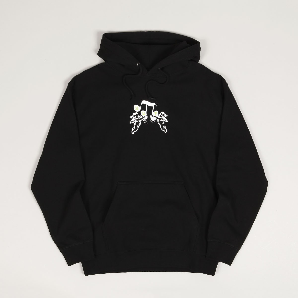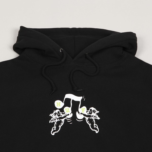 Mikina HUF s názvem Song v černé barvě má na prsou potisk andělíčků držících notu s nápisem HUF. Na levém boku decentní vlaječka značky. Stahovatelná kapuce a přední velká kapsa na ruce. Materiál 80% bavlna, 20% polyester, materiál vnitřku fleece.