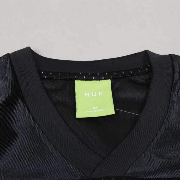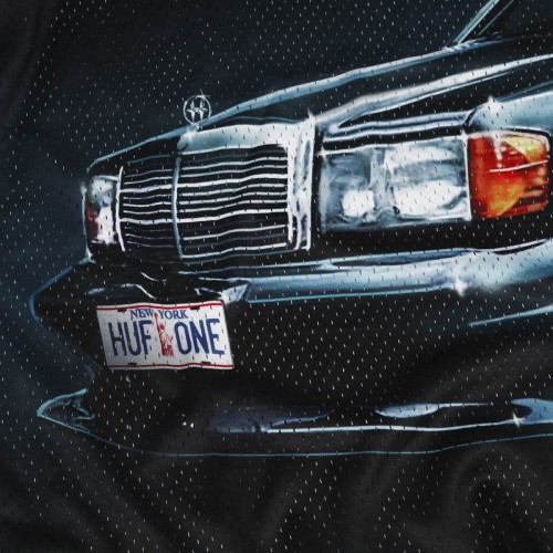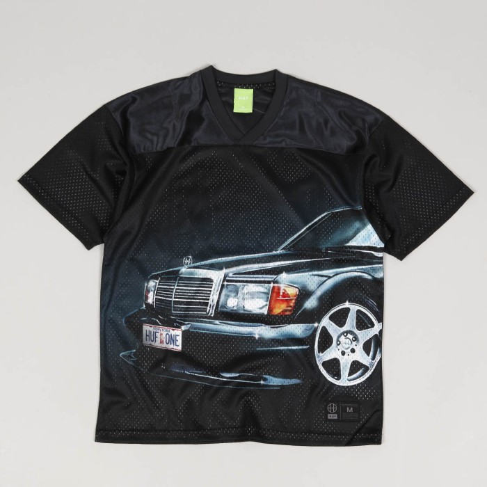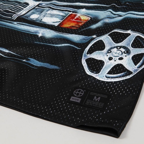 Dres HUF inspirován dresy na americký fotbal. Výstřih do V a síťované provedení s pevnou látkou na ramenou. Model s názvem H-Class Jersey v černé barvě. Grafika inspirována hudebními videoklipy z 90. let a ikonickými sportovními auty. Celoplošný motiv Mercedesu 190E evolution II s detaily HUF. Na levém spodním lemu nášivka s logem značky. Materiál je 100% poly-mesh.