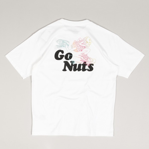 Triko Go Nuts Tee v bílé barvě z kolekce Nike SB je vyrobeno z čisté 100% bavlny. Tričko s kulatým výstřihem a žebrovaným lemováním kolem krku s všitou vnitřní páskou a krátkými rukávy. Na levé straně prsou decentní výšivka loga Nike SB a na zádech velká grafika oříšku jedoucího na skejtu s nápisem Go Nuts. Na levém boku malá decentní vlaječka Nike SB. Triko má volný střih Loose Fit ( tedy je volnější a větší, než standartní velikosti.. doporučujeme posunout o jednu velikost dolu, pokud plánuješ triko nosit, více na tělo na bežné nošení.)