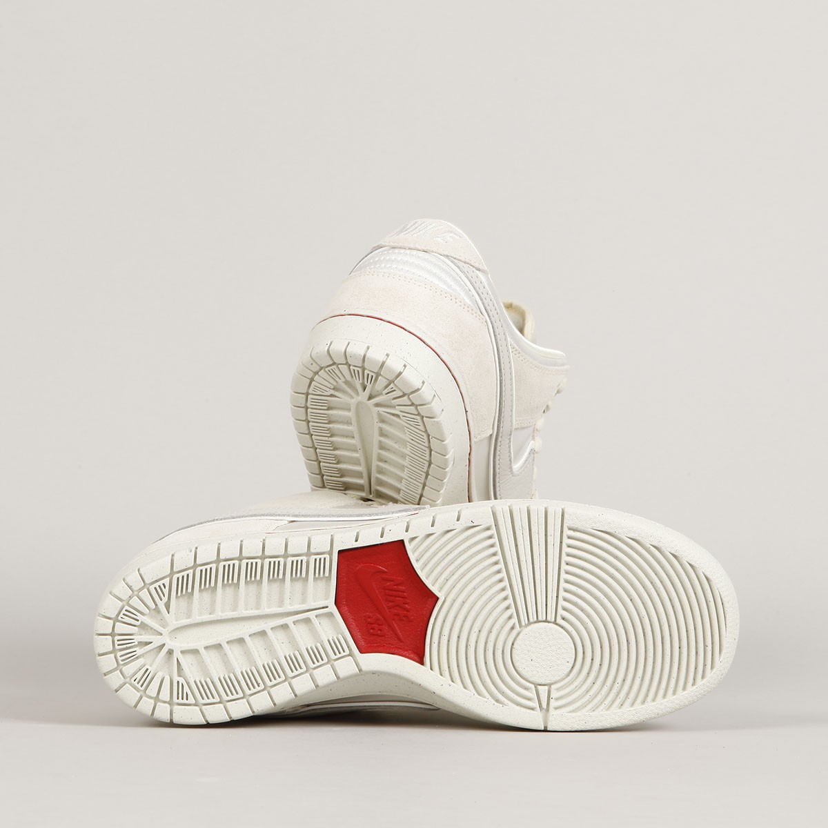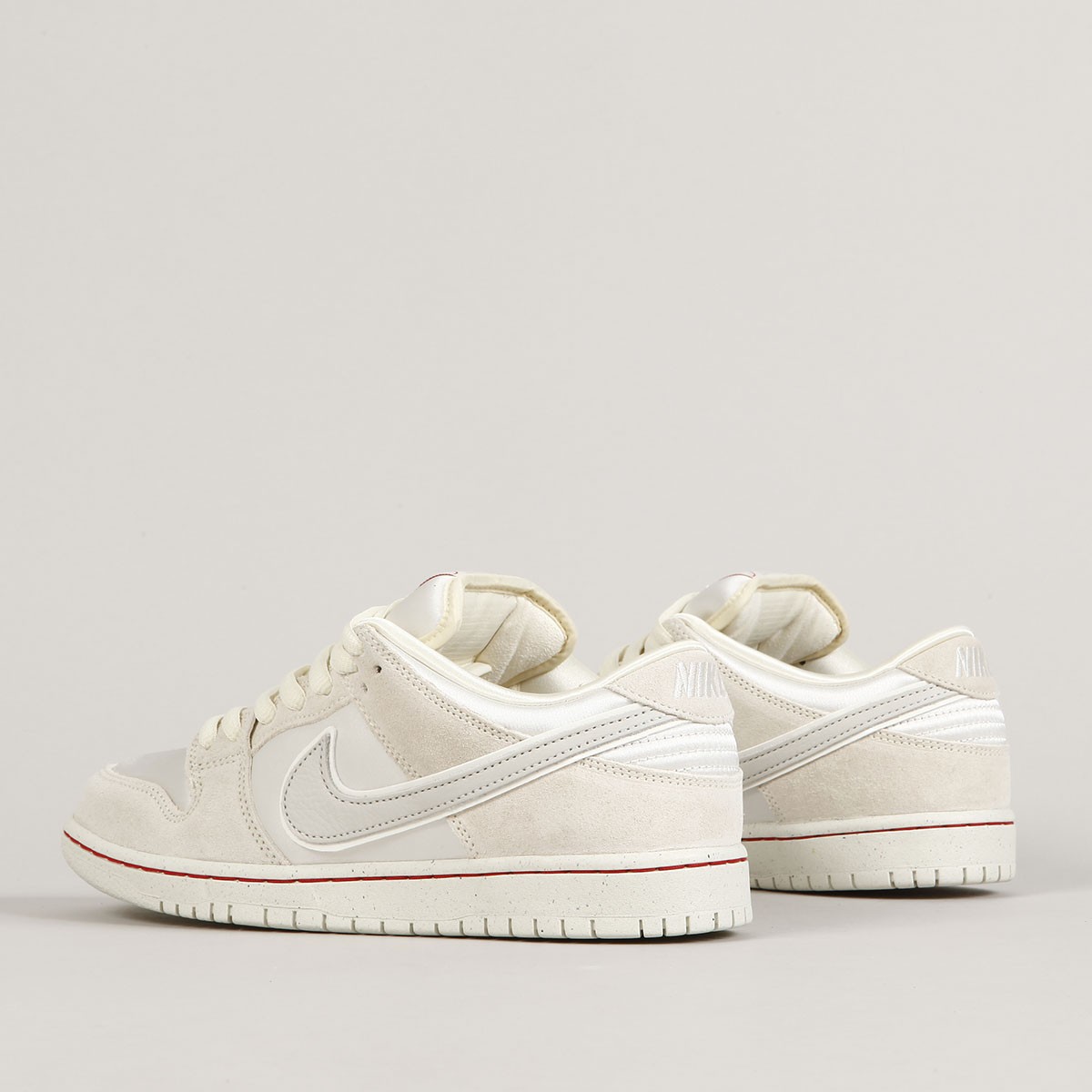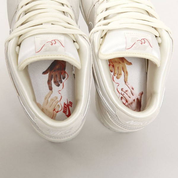Svršek je vyroben z kombinace třech různých materiálů - semiš, kůže a canvas. Béžové panely jsou vyrobeny z broušeného semiše, špička, střední panel a pata jsou z canvasu. Swoosh je vyroben z kůže. Vnitřní vložka má světlou barvu s motivem rukou spojených červenou nitkou. Silný fatty jazyk s labelm Nike SB, také omotaným červenou nitkou. Od prvního nazutí působí vyšlápnutým dojmem, odlehčená cupsole podrážka má navíc Zoom Air polštář na tlumení nárazů. Podrážka je prošita červenou nití. Klínek na jazyku zajišťuje dokonale padnoucí střih, který je zárukou vynikajícího kontaktu s prknem a jeho ovládání. V balení červené tkaničky navíc.