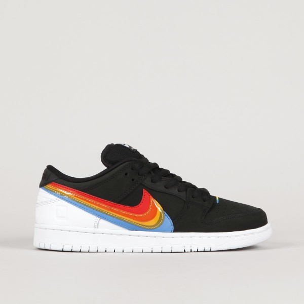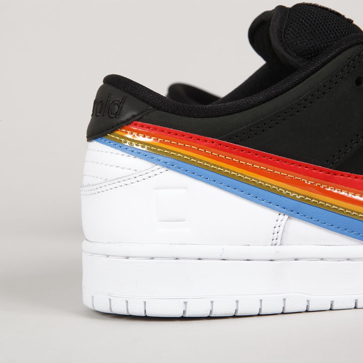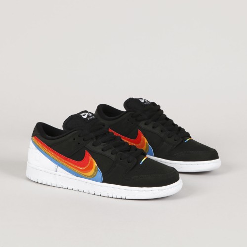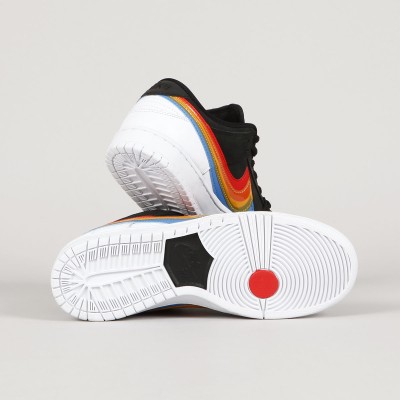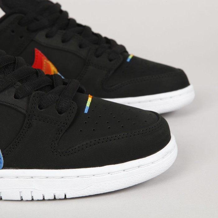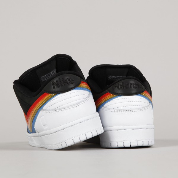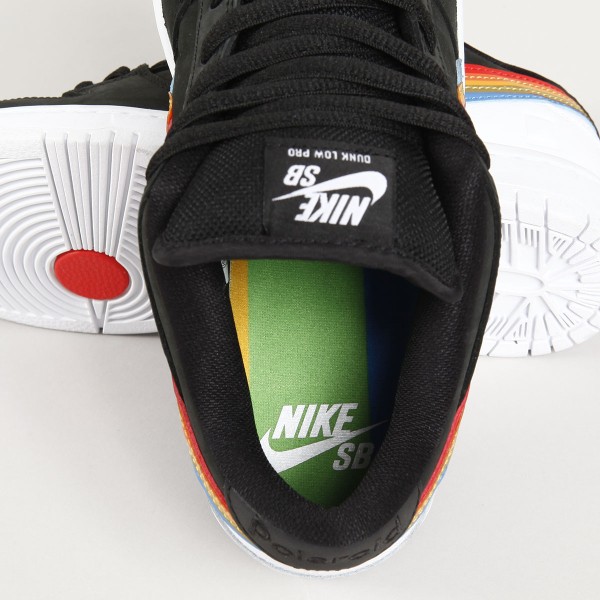 Boty Nike SB Dunk Low Pro ze speciální kolaborace s firmou Polaroid. Firma založená Edwinem H. Landem se nejvíce proslavila svými instatními fotoaparáty a filmy, které se dostaly na trh v roce 1948. Společnost byla v historii leaderem v oboru polarizovaných slunečních brýlí díky vlastnímu výtvoru polarizace světla. Designéři se nechali inspirovat duhovými barvami a kampaní "Beyond the Rainbow" (Až na konci duhy). Svršek je vyroben z hladké kůže v kombinaci černé a bílé barvy, na bocích je našitý vrstvený barevný swoosh, špička je perforovaná s decentním duhovým proužkem, odlehčená cupsole podrážka má navíc Zoom Air polštář na tlumení nárazů. Klínek na jazyku zajišťuje dokonale padnoucí střih, který je zárukou vynikajícího kontaktu s prknem a jeho ovládání. Lem kotníku je opět polstrovaný pro větší pohodlí. Patky zdobí výšivka nápisů Nike a Polaroid. Na barevné vnitřní stélce jsou natištěná s loga Nike SB a Polaroid. V balení šest barevných tkaniček navíc.