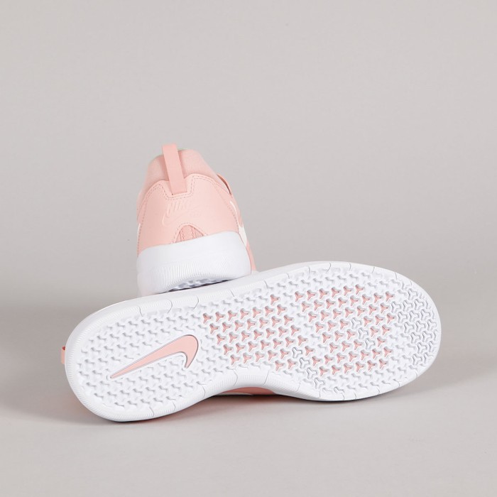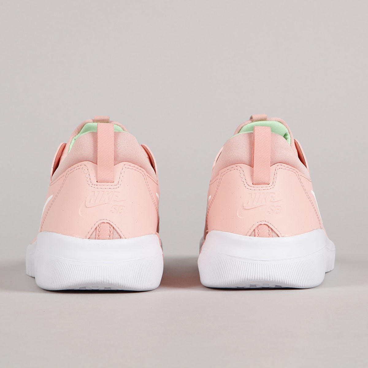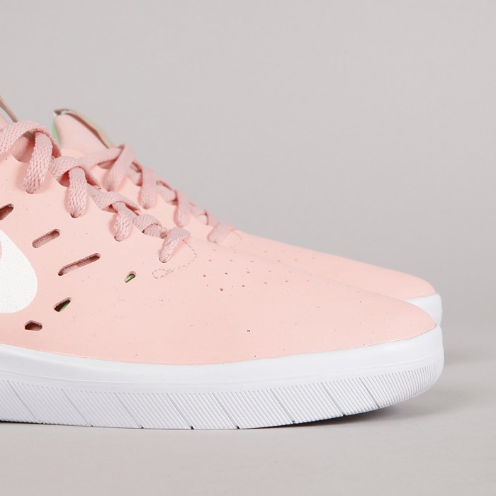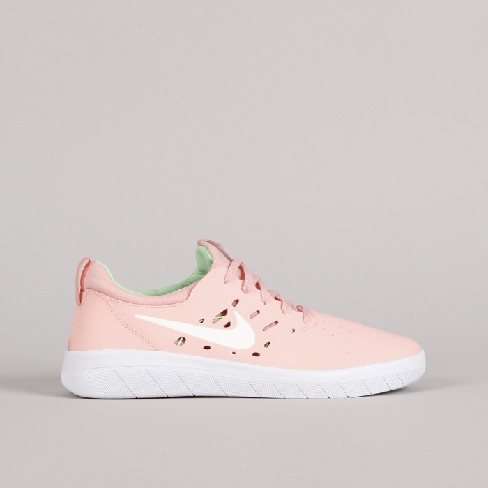 Boty Nike Skateboarding z nové kolekce. Inovativní promodel ridera Nyjaha Hustona využívající technologii Nike Free pro ještě větší svobodu pohybu. Nyjah Free jsou pohodlné boty v nízké verzi s podrážkou rozptylující tlak při každém kroku a ultralehkou konstrukcí. Svršek je v gumovém provedení, který zajišťuje pevnost, lehkost a hlavně odolnost. Má systém odvětrávání na povrchu, na jazyku poutko NYJAH a na patce vyražené logo Nike SB. Na vložkách vyobrazené hůlky a rozlitá sojová omáčka. Barevná kombinace Bleached Coral / White / Wasabi green ze skate řady značky Nike SB.