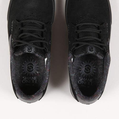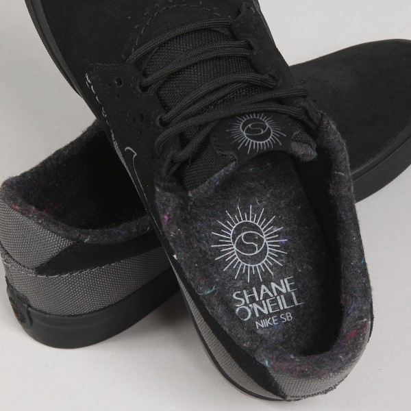 Prémiový model bot Nike SB, pro-model Shane O'Neilla v barevném provedení Black/ Smoke Grey- Iron Grey- Black. První vlastní silueta boty ridera Shanea O'Neilla za 15 let působení u SB. Nízký profil v kombinaci kůže a zesíleného canvasu, klasická vulkanická podrážka se stromečkovým vzorem. Zateplené provedení. Elastický klínek na jazyku zajišťuje dokonale padnoucí střih, pro lepší kontakt s prknem a jeho ovládání. Schované tkaničky a perforování v oblasti nártu. Vnitřní stélka s technologií Zoom Air na patě na tlumení nárazů. Na jazyku a stélce je vyobrazená signatura Shane O'neil a z boku boty vyražený swoosh. Na patce pak malý nápis Nike SB.