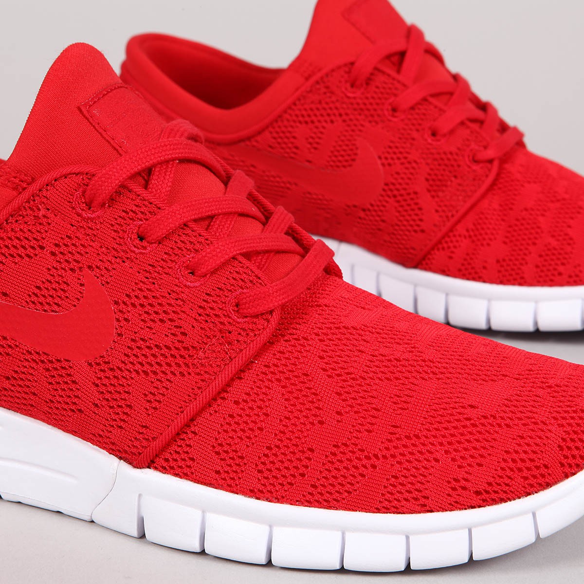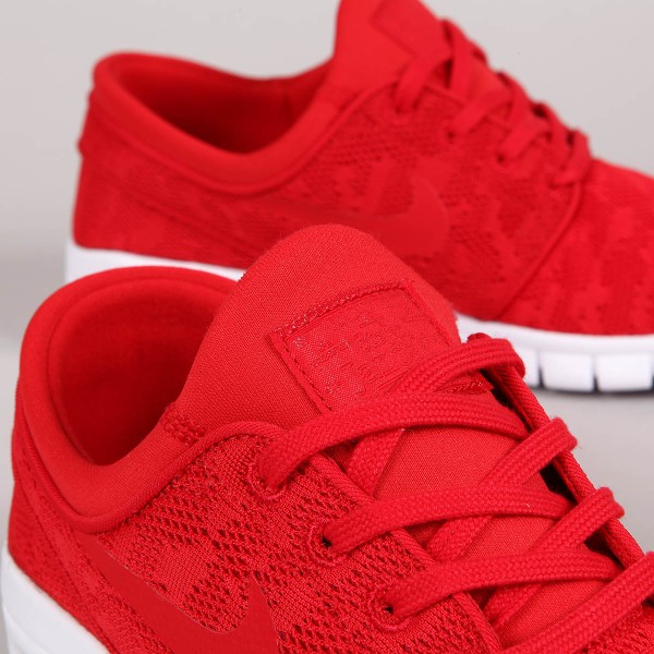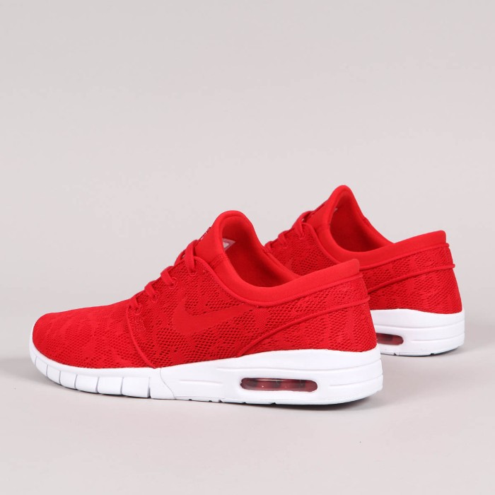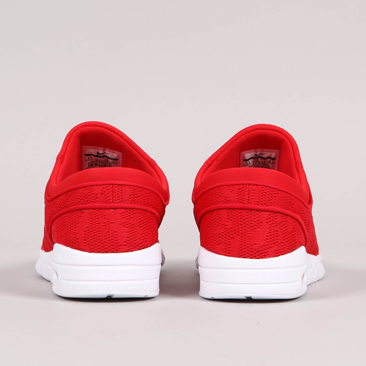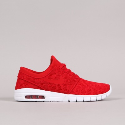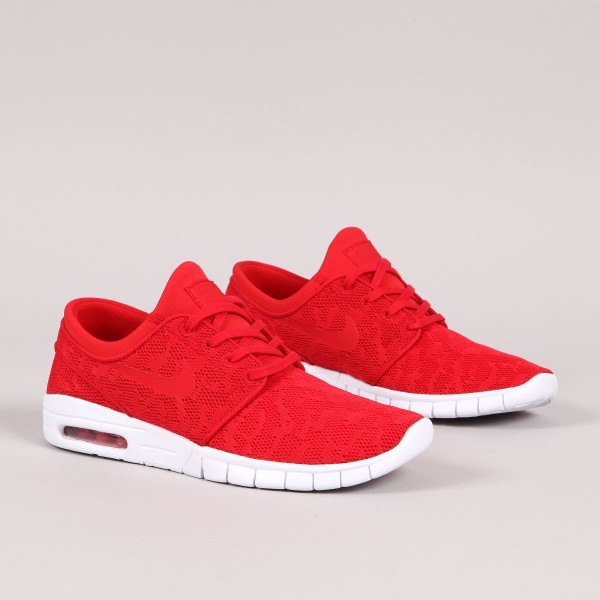 Boty Nike SB Stefan Janoski Max v barvě University Red / University Red - White s vypolstrovaným textilním vnitřkem v oblasti paty. Prodyšný svršek ze síťoviny "MESH CAMO". Z boku swoosh a odlehčená, velmi pohodlná podrážka, dobře tlumící nárazy (hybridní provedení podrážek Nike Air Max a Nike Free). Janoski label nášivka na jazyku boty. Polstrovaný vnitřní lem paty. Určeno jako odpočinková bota nejen po skateboardingu. Boty doporučujeme ošetřovat a chránit prostředky CREP.