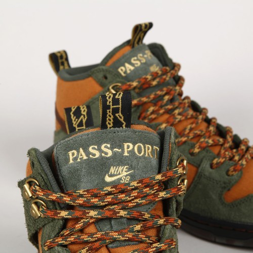 Speciální Quickstrike kolekce určená výhradně pro vybrané skateshopy. Boty Nike SB Dunk High v limitované kolekci s australskou značkou Pass~Port. Značka Pass~Port byla založena Trentem Evansem v roce 2009 v australském Brisbane, ale později přesídlila do Sydney, kde najdeš i Pass~Port skateshop. Trent chtěl kvůli nedostatku domácích skate značek vnést do subkultury skateboardingu nový čerstvý vítr. Od počátku se snažil vylepšovat a dotahovat výrobky Pass~Port k dokonalosti po všech směrech. P~P si vydobila místo ve skateshopech po celé Austrálii, ale třeba i v obchodech v Asii, Americe nebo Evropě. Značka padla do oka legendárním značkám, jako je Carhartt, Nike SB a Vans, díky tomu vzniklo několik unikátních kolaborací bot a oblečení s těmito brandy. Pass~Port představuje vášeň pro své australské dědictví a kořeny. Kotníková verze má svršek vyrobený z kombinace semiše a zesílené látky, odlehčená žíhaná cupsole podrážka má navíc Zoom Air polštář na tlumení nárazů. Na vnějších stranách patkek vyšité vlastní upravené logo se swooshem. Kovové D-kroužky odkazují na obuv do hor. Klínek na jazyku zajišťuje dokonale padnoucí střih, který je zárukou vynikajícího kontaktu s prknem a jeho ovládání. Polstrovaný jazyk a lem kotníku pro větší pohodlí, na bocích našitý kontrastní kožený swoosh. Jazyk a patu zdobí černo zlatá poutka pro snazší nazouvání. Na jazyku nášivka s logem Nike SB a Pass~Port. V balení dvoje tkaničky navíc.