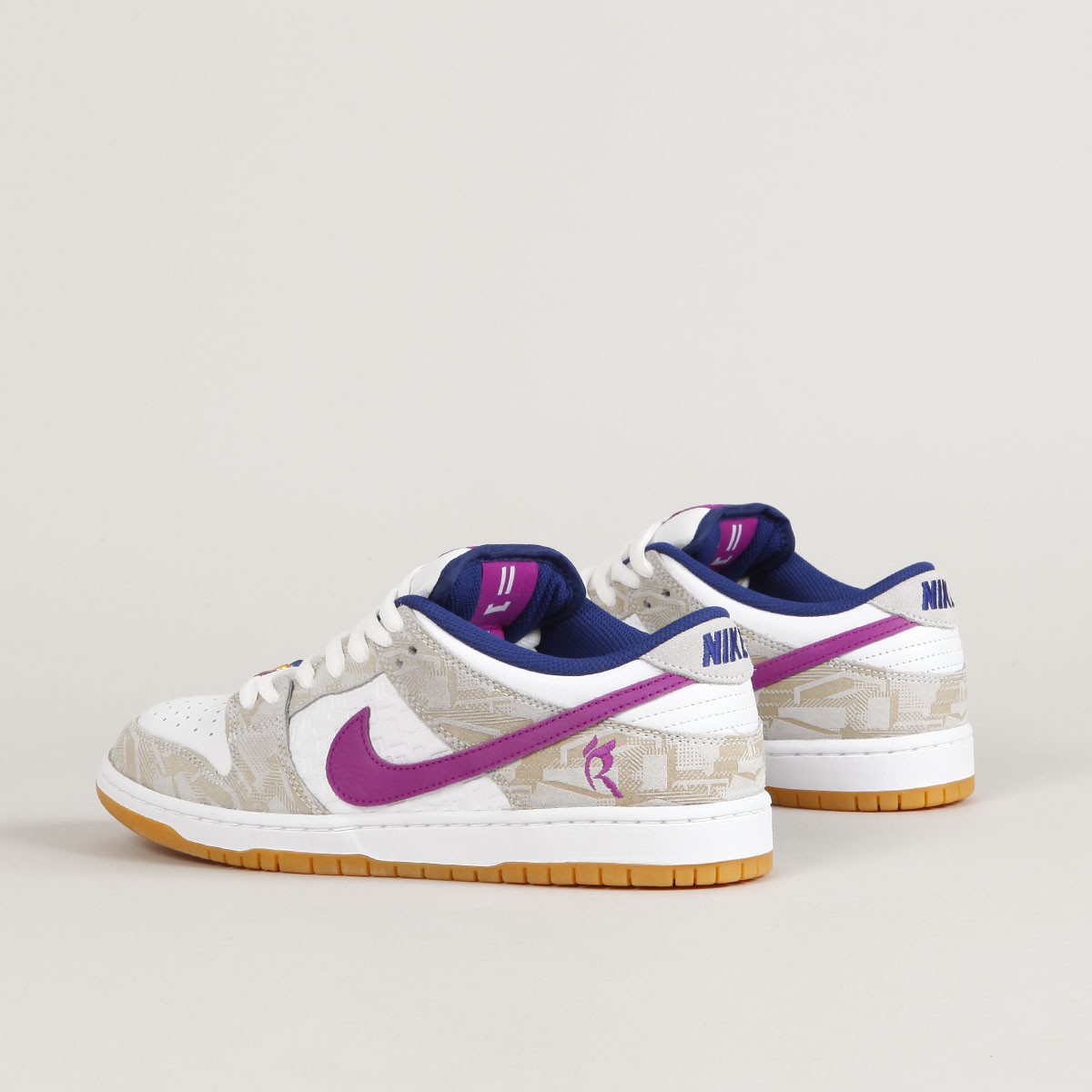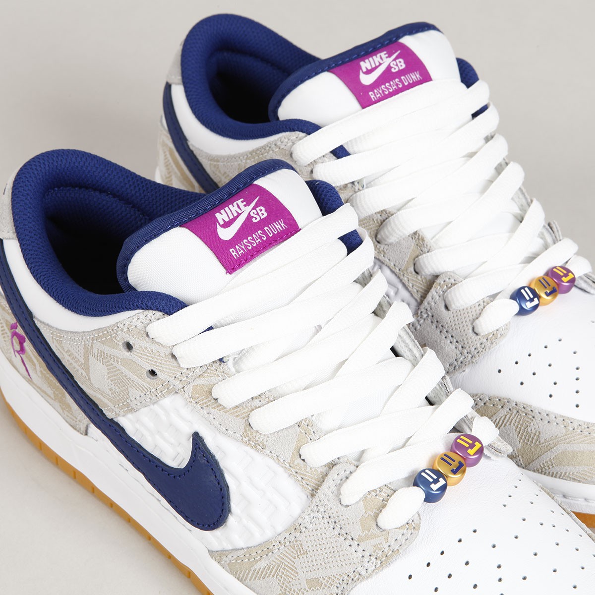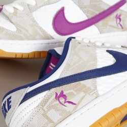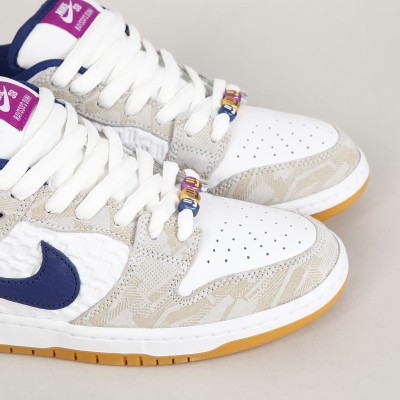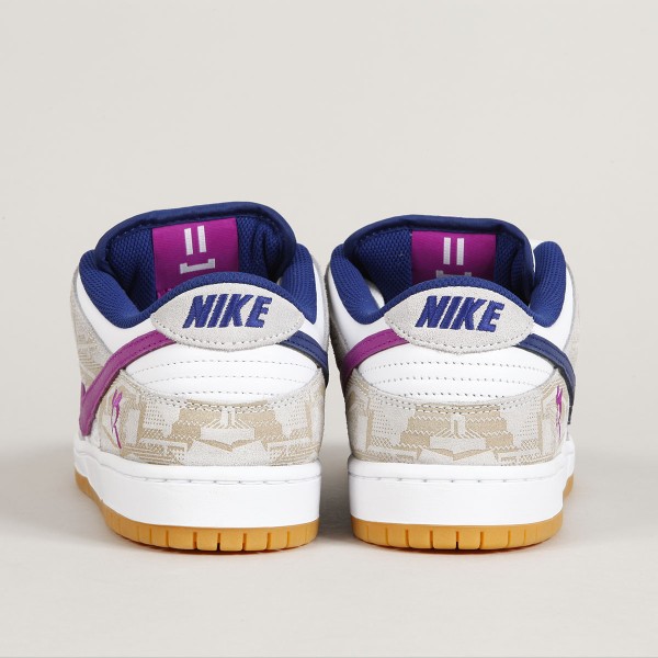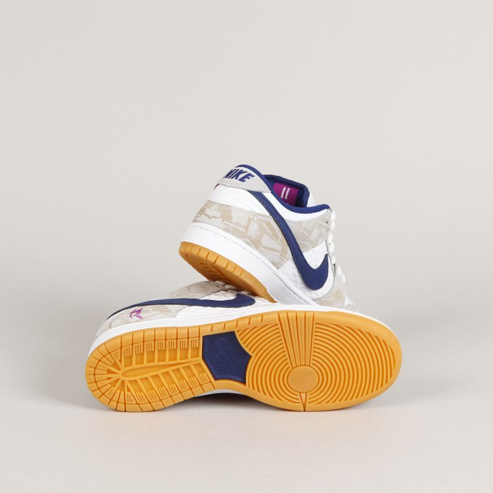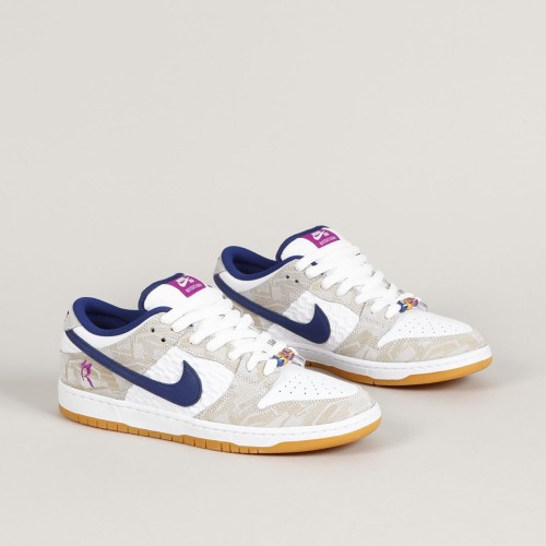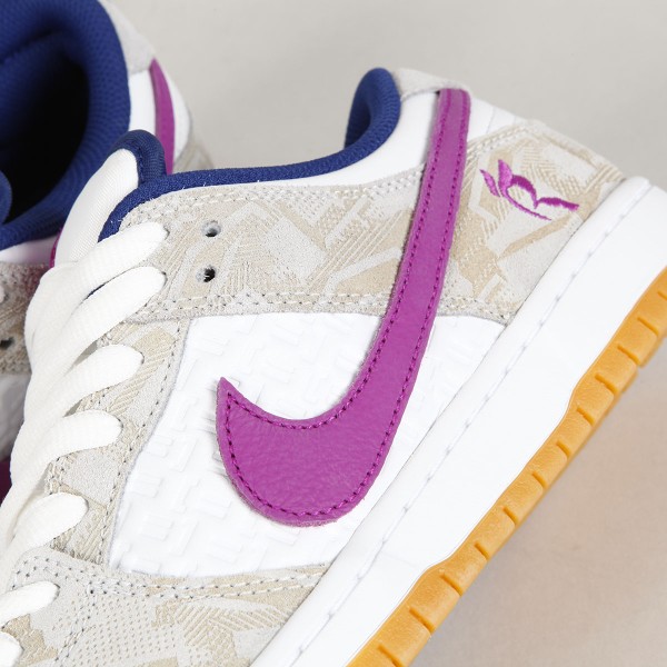 Boty Nike SB, ikonický model Dunk Low Premium Pure Platinum v kombinaci béžové, bílé, tmavě modré a světle fialové barvy. Design a colorway navrhla 16 letá brazilská skejťačka Rayssa Leal. Rayssa je velmi úspěšná závodnice, na svém kontě má například stříbrnou medaily z Olympijských her v Tokyu, dvě zlaté medaile z X Games, dvě zlaté a dvě stříbrné ze Street League a mnoho dalších. Kromě závodů také natáčí party a edity, například pro April, kde se ukázala v editu "Turbo Green". V současné době jezdí za Nike SB, April Skateboards, Bones, Mob Grip, Independent a další sponzory. Svršek je vyroben z kombinace semiše a hladké kůže s perforovanou špičkou, semišová část má design reliéfních obrazců a kožená středová část má na sobě vyražené smajlíky. Swoosh je ve dvoubarevném provedení, stejně jako vnitřní stélka. Na vnější straně pod kotníkem je vyšité písmeno R. Tkaničky zdobí tři navlečené korálky se smajlíky. Odlehčená cupsole podrážka má navíc Zoom Air polštář na tlumení nárazů. Klínek na jazyku zajišťuje dokonale padnoucí střih, který je zárukou vynikajícího kontaktu s prknem a jeho ovládání. Lem kotníku je opět polstrovaný pro větší pohodlí. Na jazyku kontrastní label Nike SB s nápisem Rayssa's Dunk. V balení dvoje tkaničky navíc.