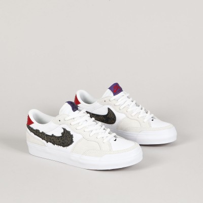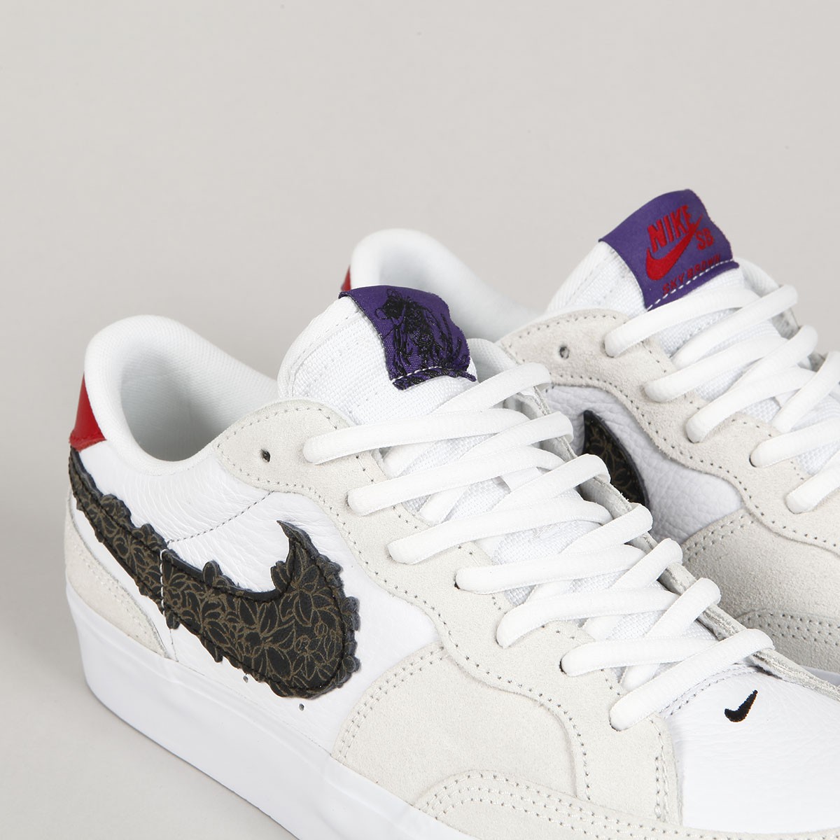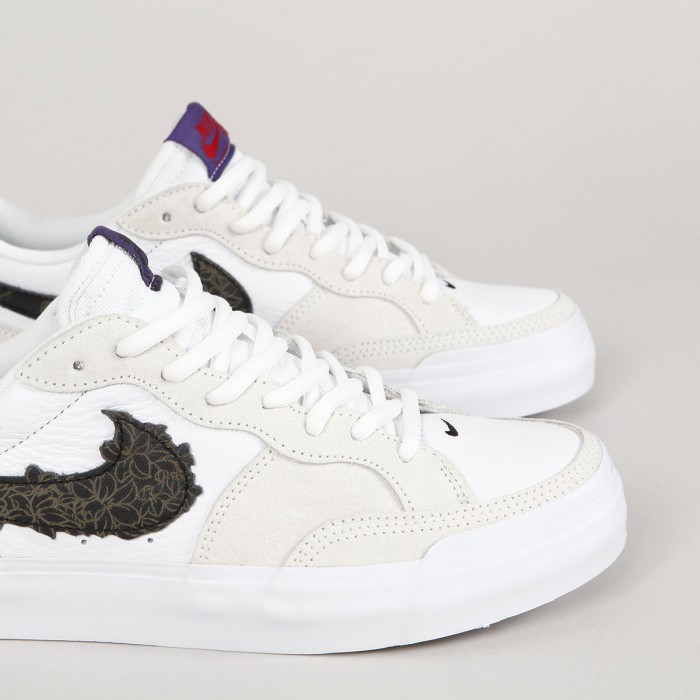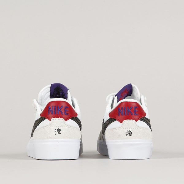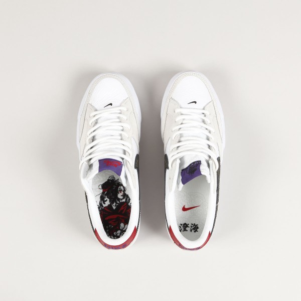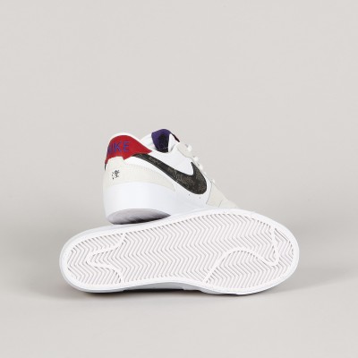 Boty Nike Skateboarding, model Pogo Plus ve speciální Quickstrike limitované kolekci v barevném provedení Sail/ White/ Gym Red/ Black. Na designu se podílela Sky Brown, skejťačka z týmu Nike SB. Svršek vyroben z kombinace kůže a semiše, vrstvená prošívaná špička, vulc podrážka s klasickým stromečkovým vzorem a zvýšeným lemem na špičce. Uvnitř vožka se systémem Zoom Air pod patou pro tlumení nárazů a větší pohodlí. Na boku boty a špičce ikonický swoosh. Na patce je vyšité logo Nike SB. Signatura loga Nike na jazyku a vnitřní stélce. Barvy jsou inspirované britskou státní vlajkou - modrou, červenou a bílou, detaily zase japonskou kulturou. Swoosh má decetní zlatý motiv listů Sakury, na jazyku a vnitřní stélce je vyobrazena Geisha, v zadní části na patě je vyražený japonský nápis.