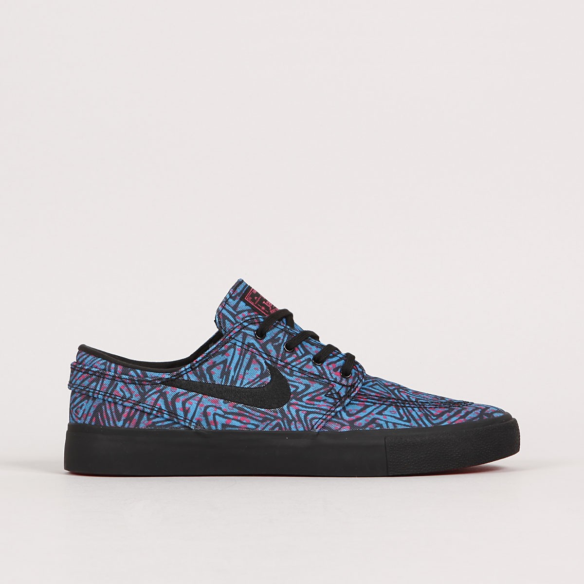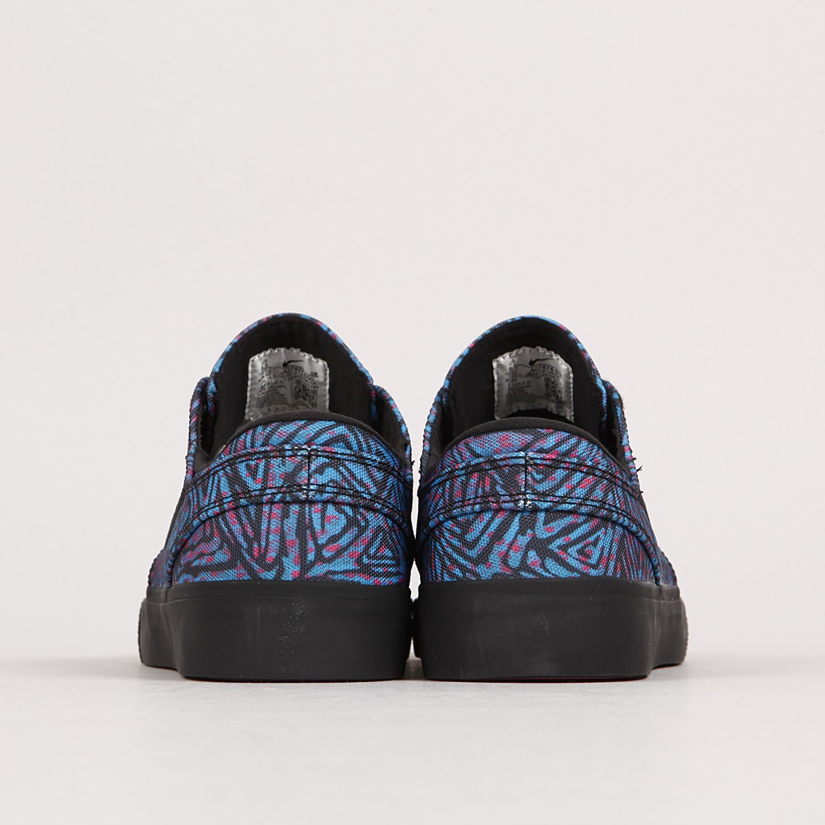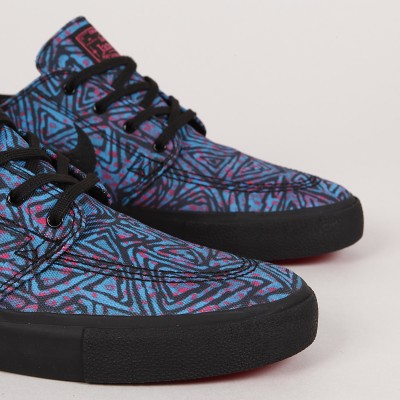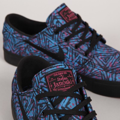 Boty Nike SB, promodel Stefana Janoski Remastered v barevném provedení Watermelon Black s celoplošnou grafikou černých ornamentů a růžových cákanců. Přepracovaná nízká silueta s canvasovým svrškem a klasickou vulkanickou podrážkou v růžové barvě. Na jazyku je nášivka labelu Nike Skateboarding a z boku vyšitá Nike fajfka. Vnitřní stélka s technologií Zoom Air na patě na tlumení nárazů.