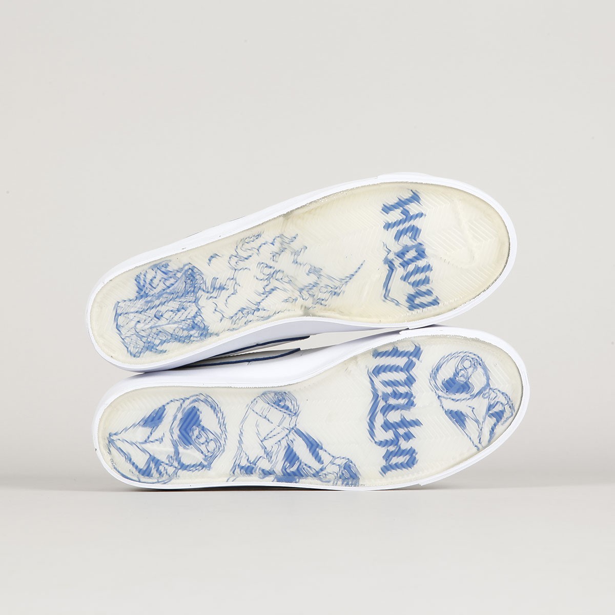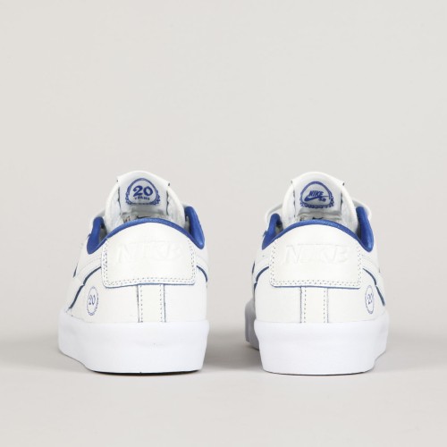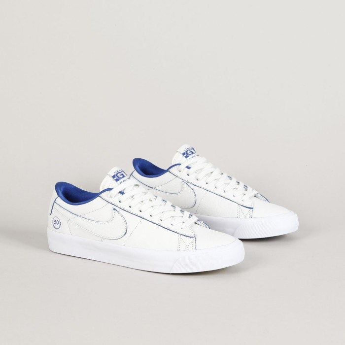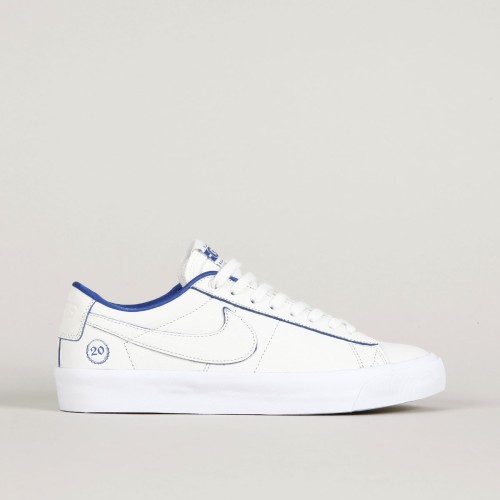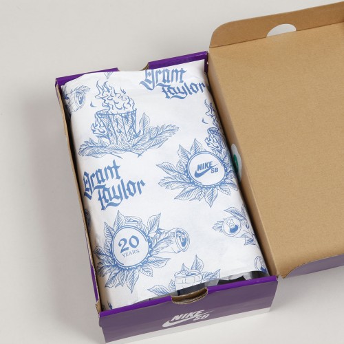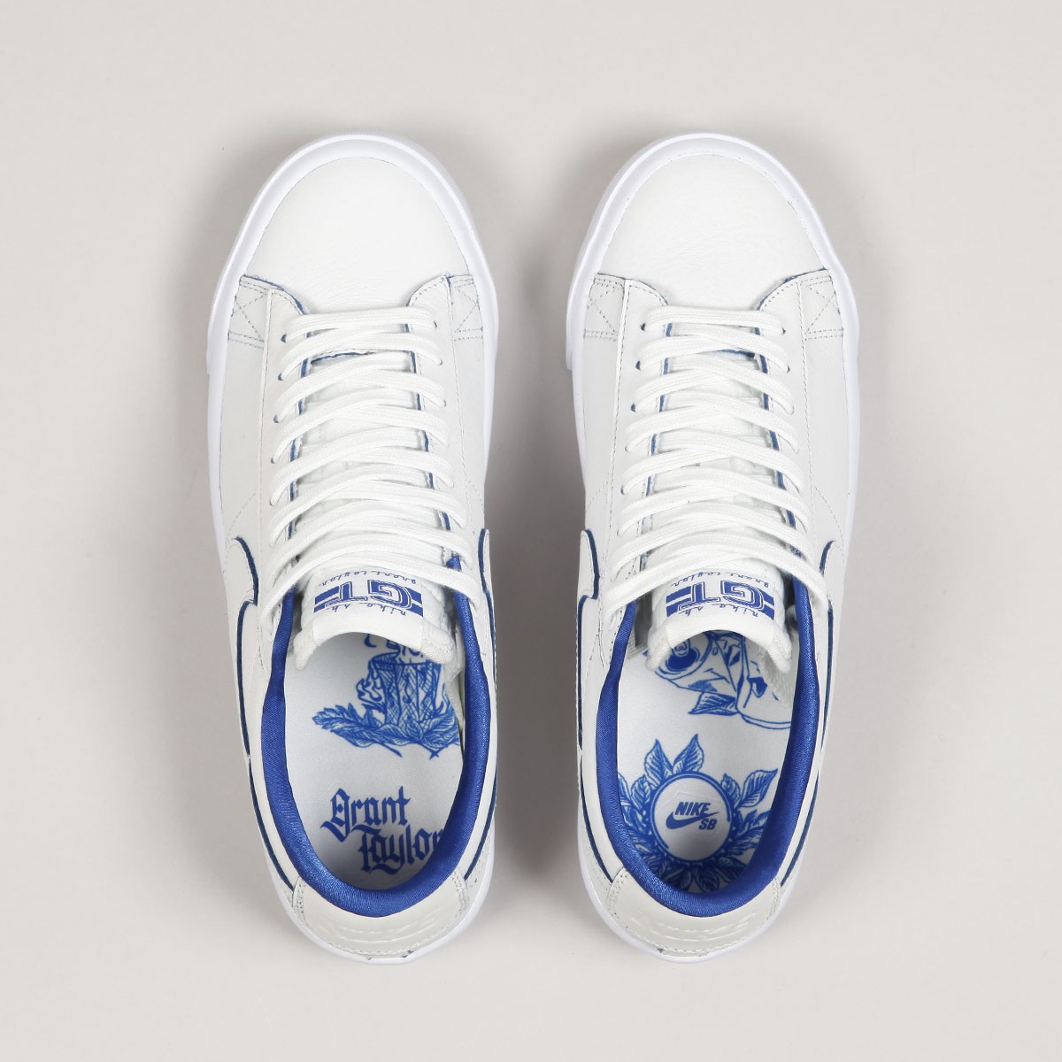 Boty Nike SB, promodel ridera Granta Taylora. Blazer Low GT Premium v barevném provedení Summit White Game Ryal jsou ze speciální kolekce k oslavě 20. letého výročí Granta Taylora u Nike SB. Legendární model bot Blazer od Nike v předělávce pro Skateboarding sekci. Tento model má svršek z kůže, z boku našitý swoosh a na jazyku je nášivka Nike SB. Na patě vyražený nápis Nike a pivní zátka s číslem 20. Vršek bot je natřen bílou barvou, která se postupným nošením odíra na základní modrou barvu. Vnitřní stélka je navíc vybavena technologií Zoom Air pod patou a zajištujě ochranu při dopadu a tlumení tvrdých nárazů. Díky vulc podrážce se stromečkovým vzorem perfektně přilne k různým typům povrchů a zaručuje tak skvělý kontakt s prknem. Na vnitřní stélce a podrážce je grafika koše, plechovek a zátek od piva. Tyto boty jsou primárně určeny na skateboarding, ale využití najdou i při dalších sportech a běžném nošení. Uvnitř balení sada samolepek.