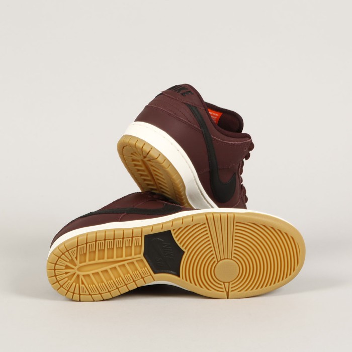 Model bot Nike SB Dunk Low Pro v barevném provedení Burgundy Crush Black z limitované kolekce Orange label, nebo také nazývaná jako ISO řada (in skateshops only). Nízká verze má svršek vyrobený z hladké kůže s perforovanou špičkou a černého koženého swooshe. Odlehčená cupsole podrážka má navíc Zoom Air polštář na tlumení nárazů a tentokrát má barevné provedení White Gum. Klínek na jazyku zajišťuje dokonale padnoucí střih, který je zárukou vynikajícího kontaktu s prknem a jeho ovládání. Tlustý textilní jazyk s logem Nike SB a polstrovaný lem kotníku pro větší pohodlí.