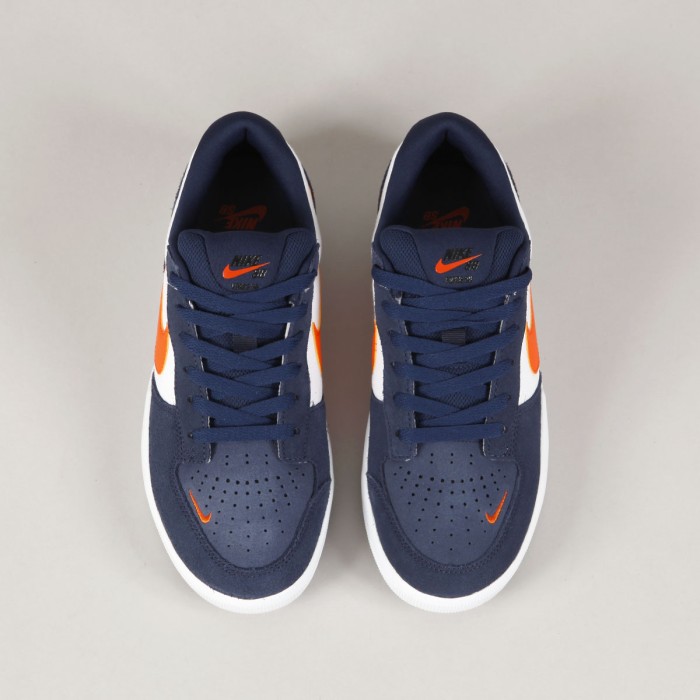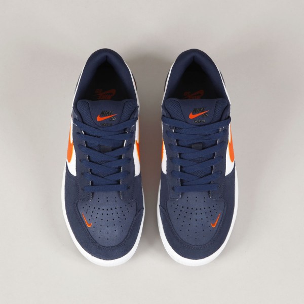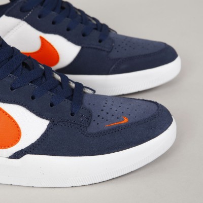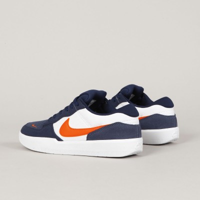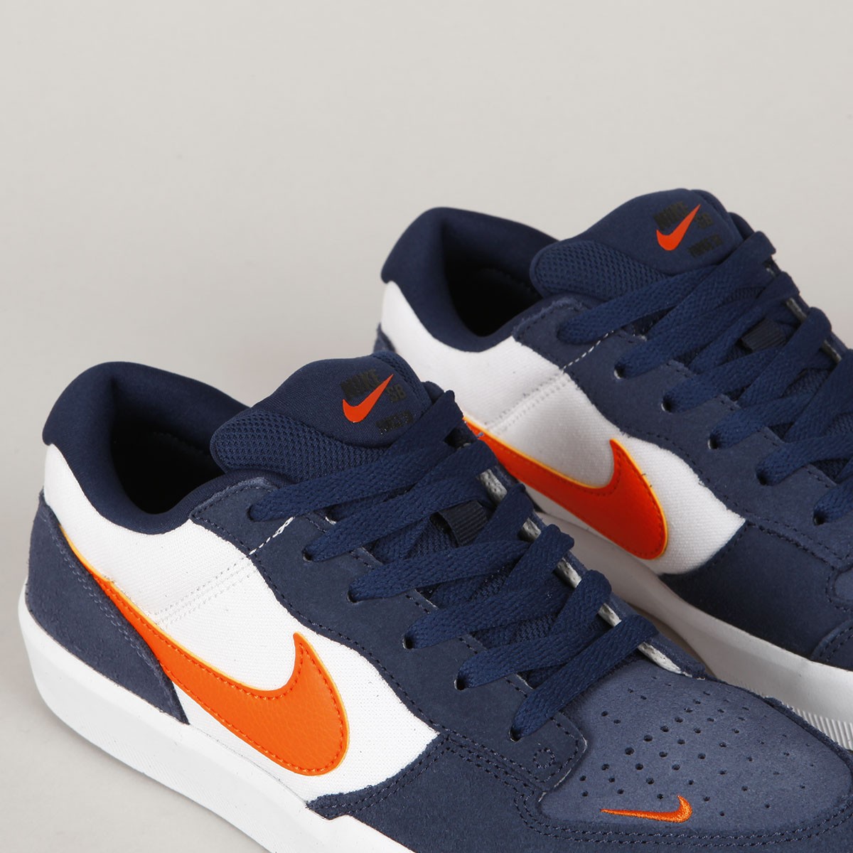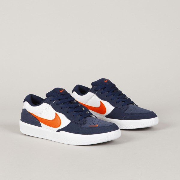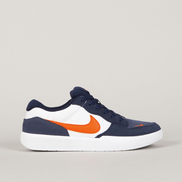 Boty Nike Skateboarding, nový model Force 58 v barevném provedení Midnight Navy Safety Orange. Jsou inspirovány basketbalovými botami. Svršek vyroben z semiše a canvasu, perforovaná špička pro lepší prodyšnost, gum podrážka kombinuje odolnost Cupsole a pružnost vulkanizované konstrukce. Vzorek Tri-Star při došlápnutí rozptyluje tlak a přiléhá tak lépe k povrchům. Na boku boty a špičce ikonický swoosh. Na patce je vyražené logo Nike SB. Signatura loga Nike na jazyku a vnitřní stélce.