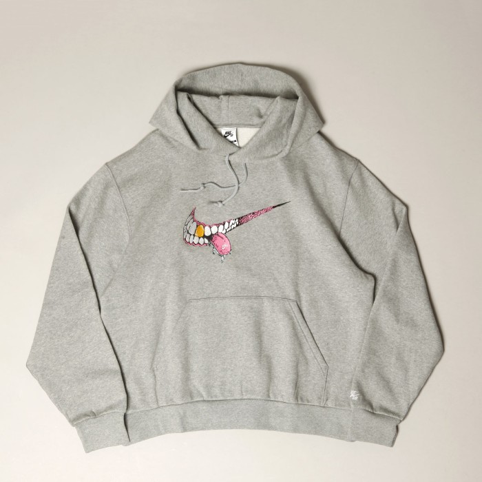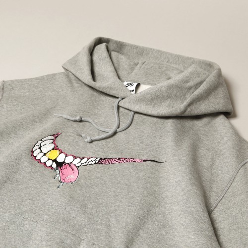 Mikina Nike SB Swoosh Grill Hoodie má stahovatelnou kapuci na tkaničky a vepředu velkou kapsu na ruce s další skrytou kapsičkou uvnitř. Na hrudi má vyšitý swoosh s motivem zubů a vypláznutého jazyku s logem Nike SB. Levý rukáv zdobí kontrastní logo značky.