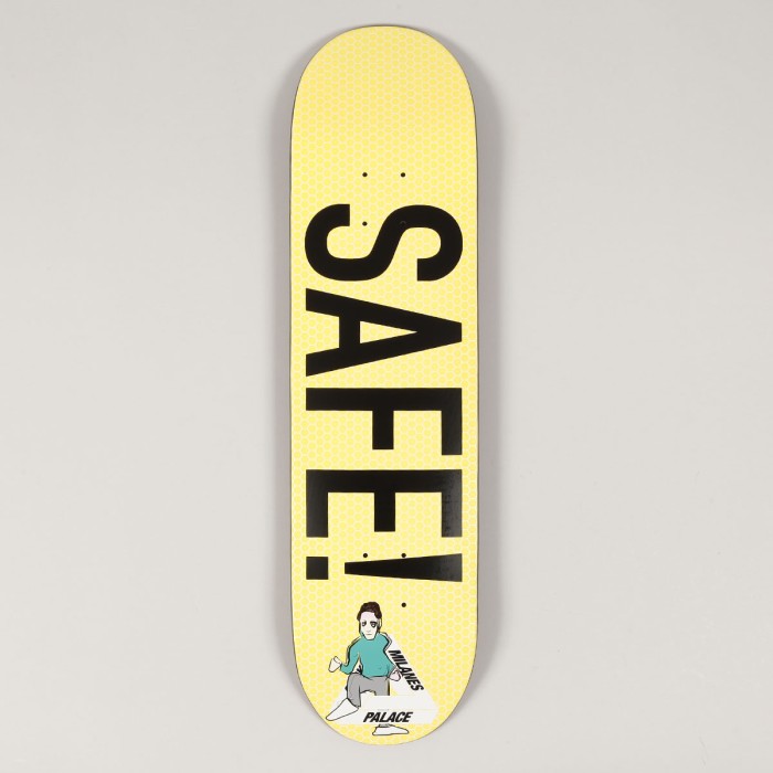 Skate deska od britské značky Palace Skateboards, za kterou jezdí jména jako Fairfax, Brady, Todd, Puig a další. Pro model Rory Milanes Pro Drawing Deck ve velikosti 8.06 palců s grafikou kreslené postavičky Roryho a velkého nápisu SAFE!. Na patce logo Palace. Ke každé desce grip zdarma. Vrchní barvená strana desky se může lišit oproti fotce.