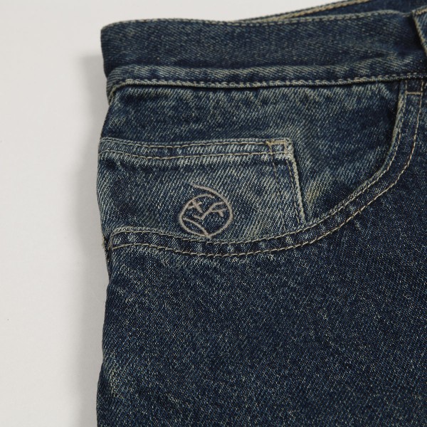 Kalhoty Polar Skate Co. s názvem Big Boy Jeans ve špinavé tmavě modré barvě. Mají široký retro střih s širokými nohavicemi. Zapínáni na zakrytý zip a knoflík. V pravé kapse nášivka smajlíka. Vyrobeno ze 100% bavlny, 435 g. Vyrobeno v Polsku.