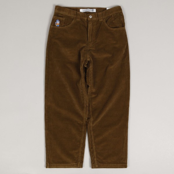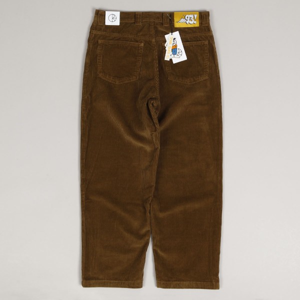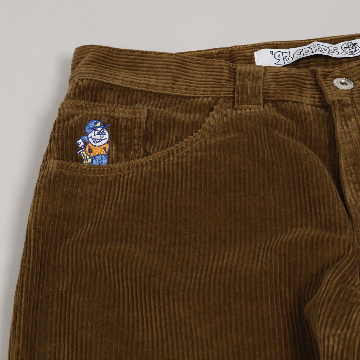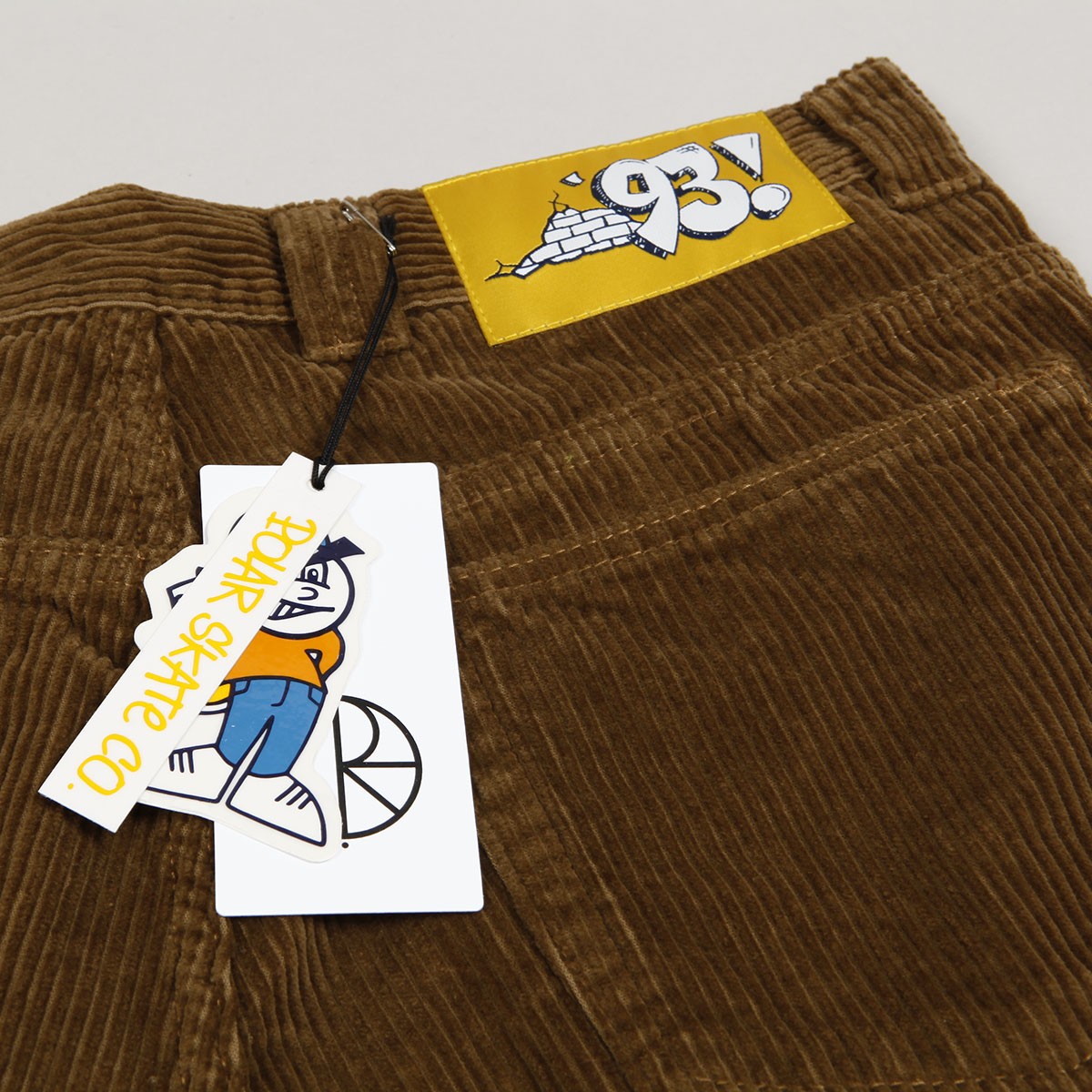 Manšestrové kalhoty Polar Skate Co. s názvem 93 Cords Pants v hnědé barvě. Mají širší retro střih s rovnými nohavicemi. Zapínáni na zakrytý zip a knoflík. V pravé kapse nášivka kluka se sprejem v ruce. Vyrobeno ze 100% bavlny. Vyrobeno v Polsku.