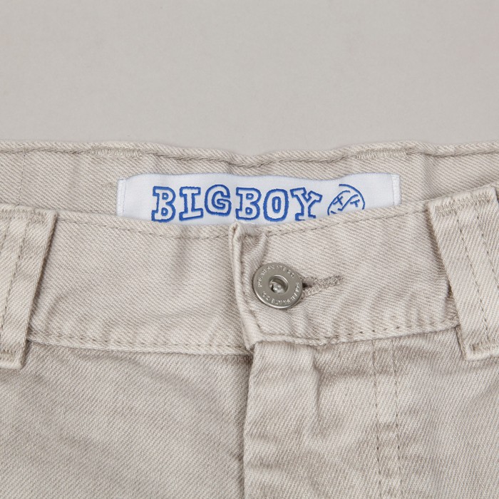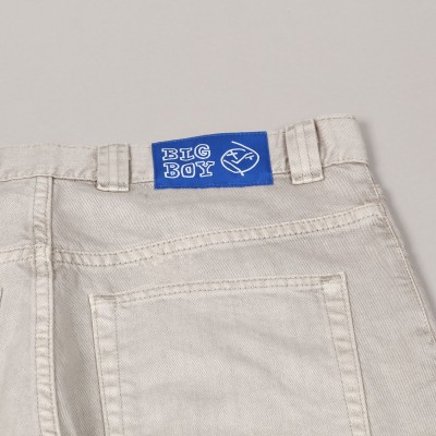 Kalhoty Polar Skate Co. s názvem Big Boy Jeans ve světlé šedo-béžové barvě. Mají široký retro střih s širokými nohavicemi. Zapínáni na zakrytý zip a knoflík. V pravé kapse nášivka smajlíka. Vyrobeno ze 100% bavlny, 435 g. Vyrobeno v Polsku.
