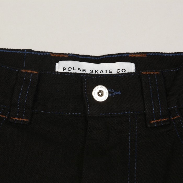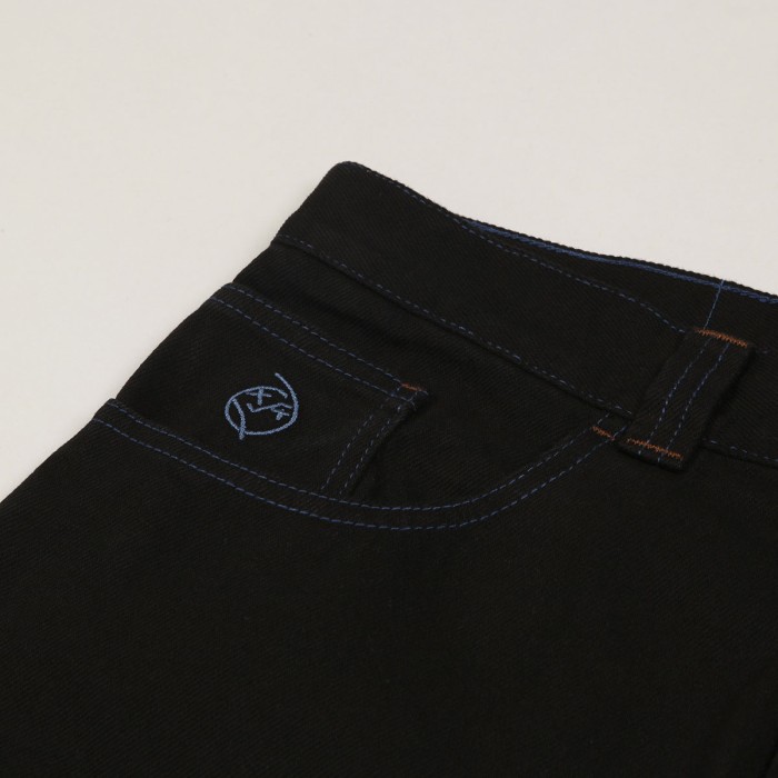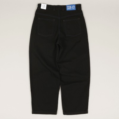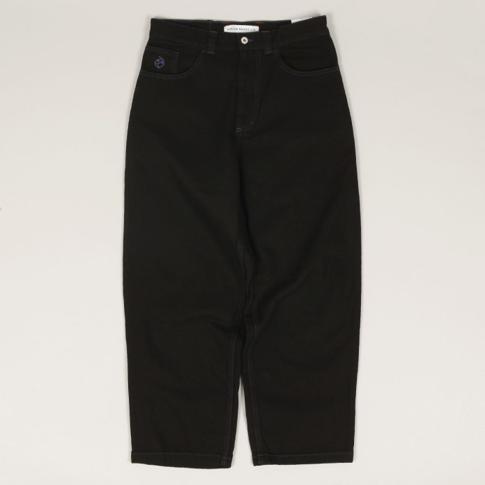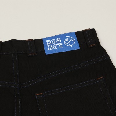 Kalhoty Polar Skate Co. s názvem Big Boy Jeans v černé barvě s kontrastním modrým prošíváním. Mají široký retro střih s širokými nohavicemi. Zapínáni na zakrytý zip a knoflík. V pravé kapse nášivka smajlíka. Vyrobeno ze 100% bavlny, 435 g. Vyrobeno v Polsku.