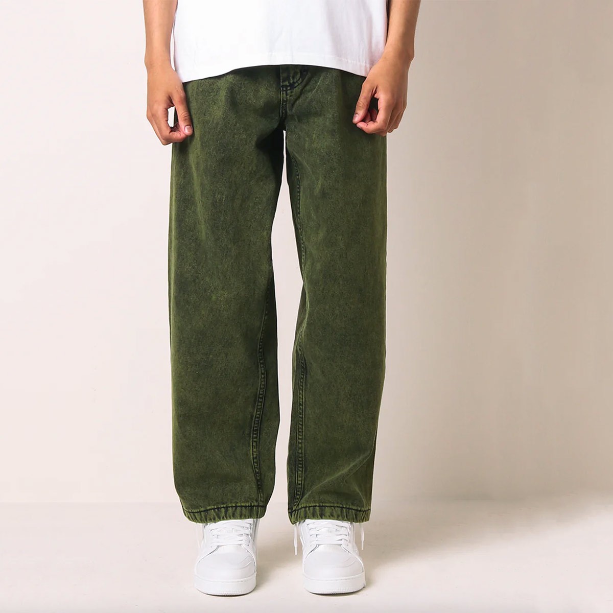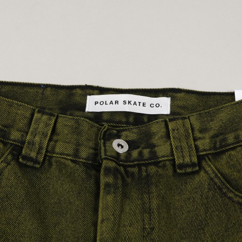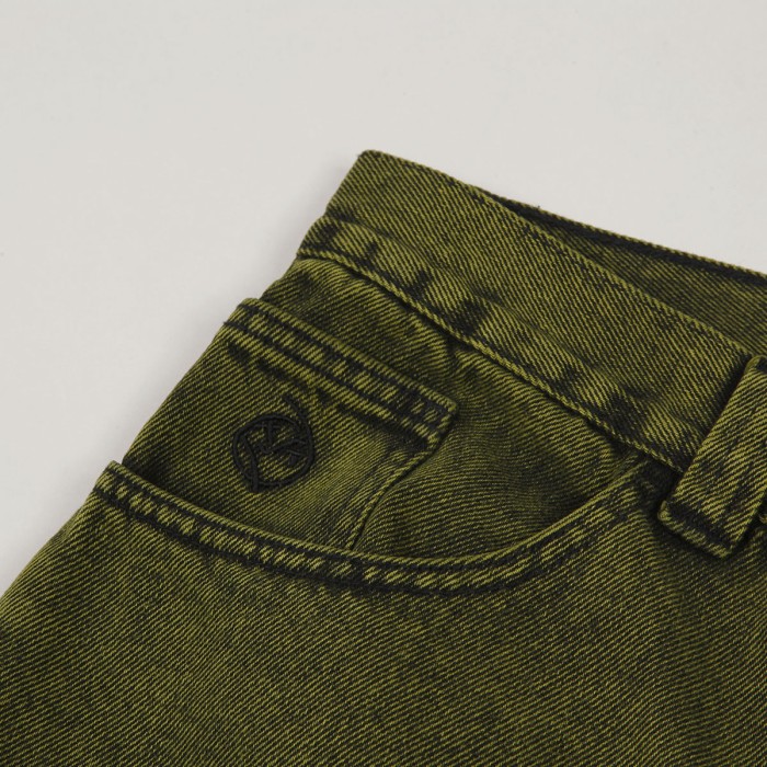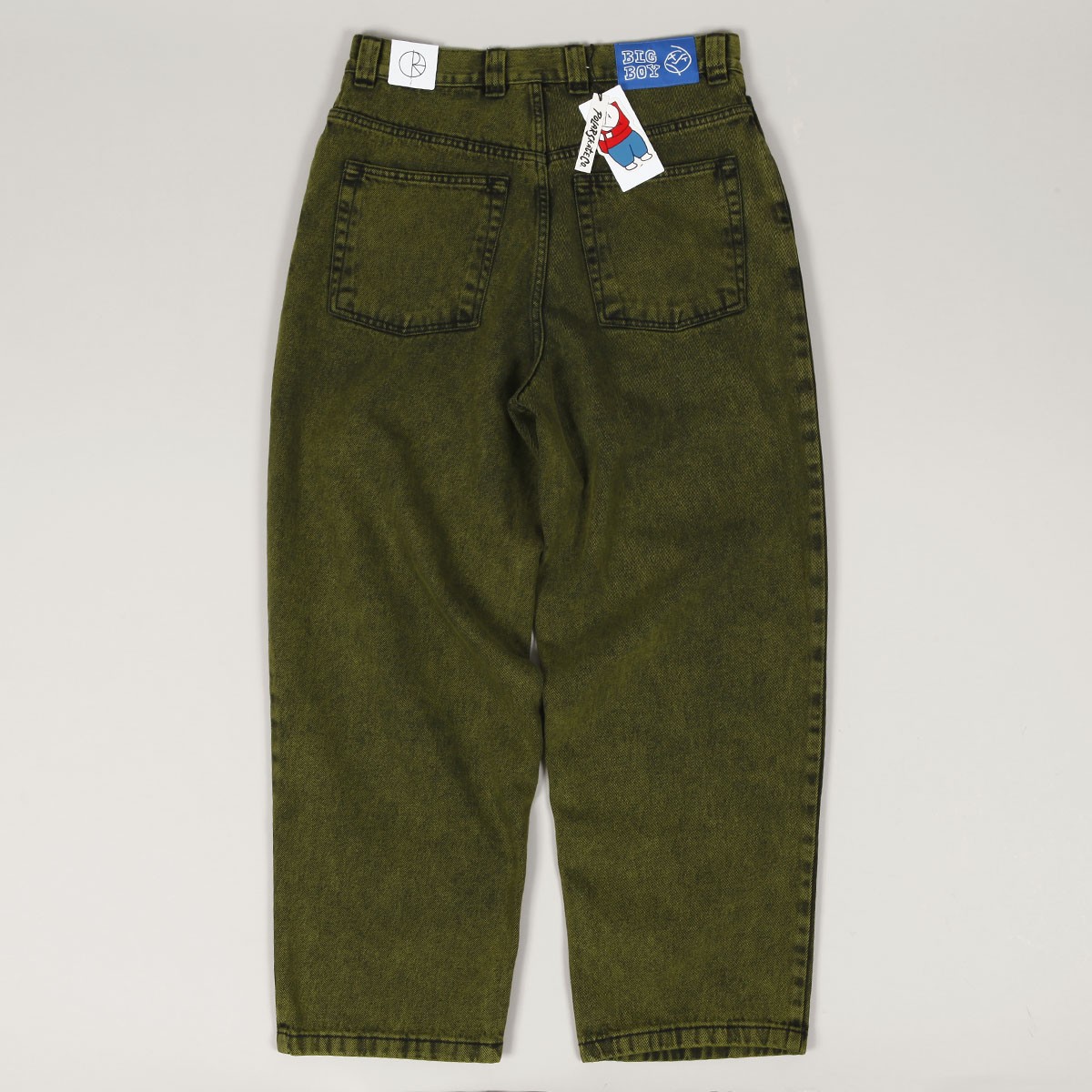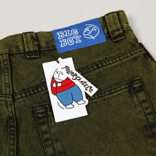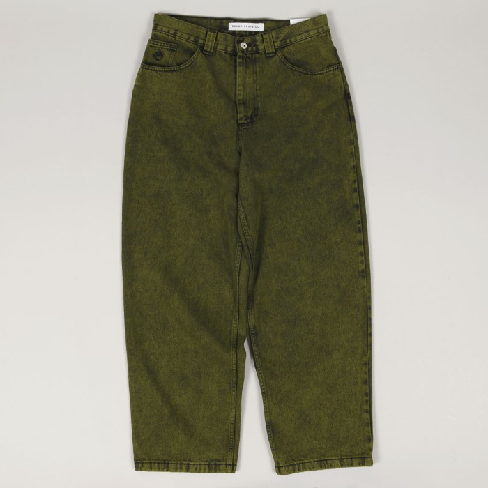 Kalhoty Polar Skate Co. s názvem Big Boy Jeans v žíhané zelené barvě s lehkým černým nádechem. Mají široký retro střih s širokými nohavicemi. Zapínáni na zakrytý zip a knoflík. V pravé kapse nášivka smajlíka. Vyrobeno ze 100% bavlny, 435 g. Vyrobeno v Polsku.