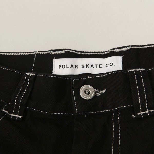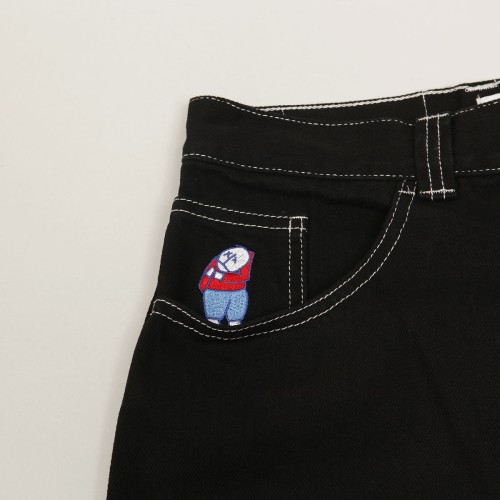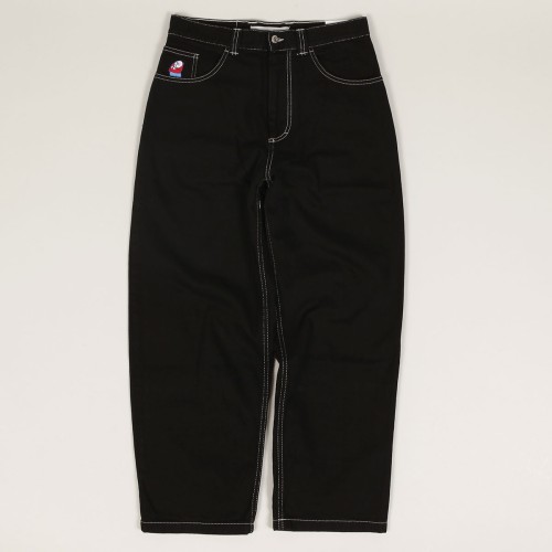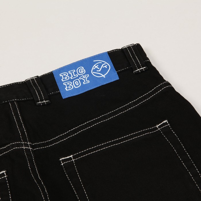 Kalhoty Polar Skate Co. s názvem Big Boy OG Logo Jeans v černé barvě s kontrastním bílým prošíváním. Mají široký retro střih s širokými nohavicemi. Zapínáni na zakrytý zip a knoflík. V pravé kapse vyšité originální logo Big Boy - postavička v červeném tričku. Vyrobeno ze 100% bavlny, 435 g. Vyrobeno v Polsku.
