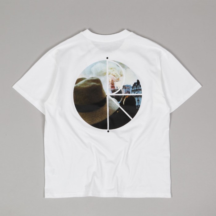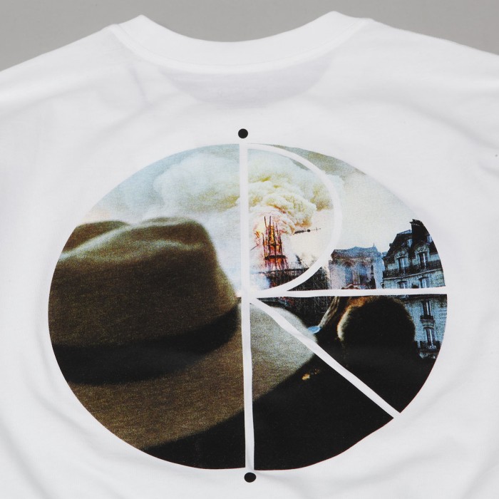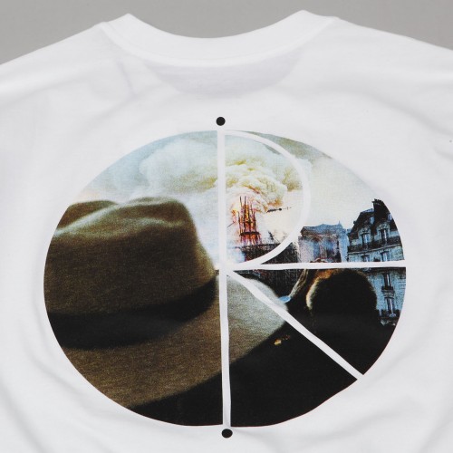 Triko Polar Skate Co. s krátkým rukávem s názvem Notre Dame Fill Logo Tee v bílé barvě. Menší nápis na prsou a velké logo Polar na zádech trika. Grafika s motivem hořící katedrály Notre Dame v Paříži, fotografii pořídil team rider Paul Grund. Materiál 100% bavlna, 210 g.
