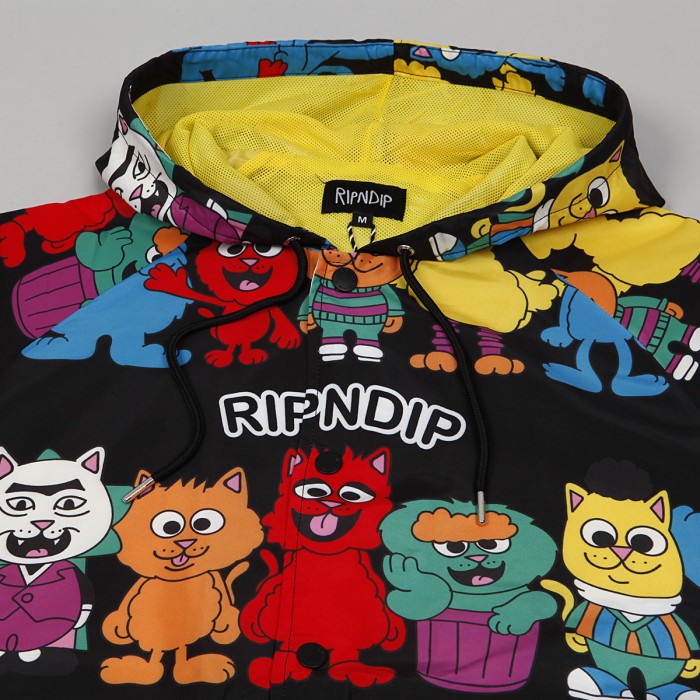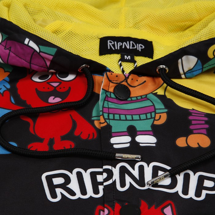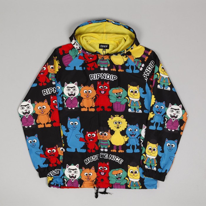 Lehká větrovka Ripndip s názvem Nerm Street Hooded Coach Jacket. Celoplošná grafika odkazující na seriál Sesame Street (Sezamová Ulice) s nápisy Must Be Nice a Ripndip. Vepředu dvě kapsy, zapínání na cvočky a kapuca se stahováním na tkaničky.