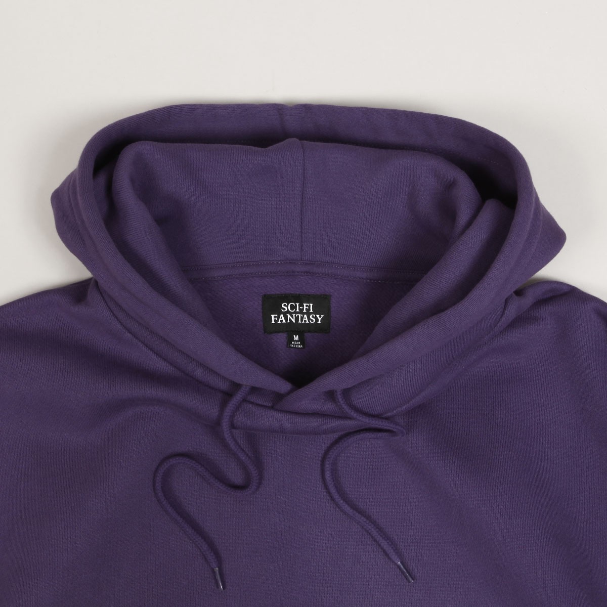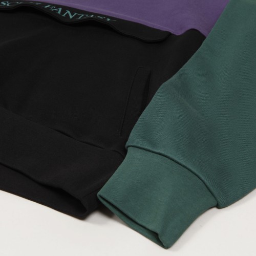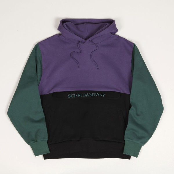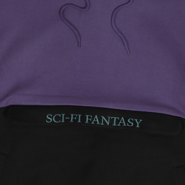 Mikina Sci-Fi Fantasy s názvem Colorblocked Hoodie v kombinaci fialové a černé barvy. Má zúžené žebrované rukávy a pas, kapucu se stahováním na tkaničku. Na břiše skrytá velká klokaní kapsa se zapínáním na zip. Na břiše vyšitý velký kontrastní nápis Sci-Fi Fantasy. Vyrobeno z bavlny s vyšší gramáží.