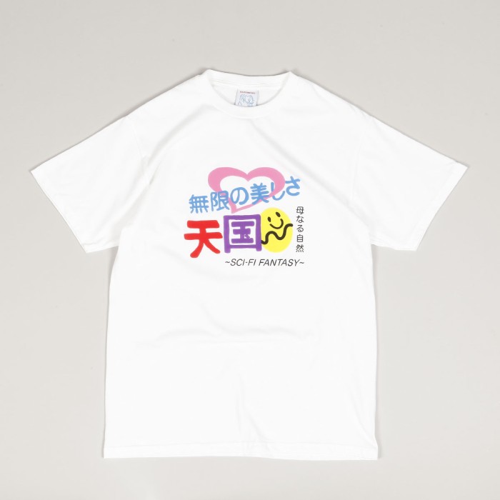 Triko Sci-Fi Fantasy s názvem Foreign Figures Tee v bílé barvě. Má kulatý límeček a krátké rukávy. Na prsou je grafika srdíčka, japonských nápisů a nápisu Sci-Fi Fantasy. Vyrobeno z bavlny s vysokou gramáží.